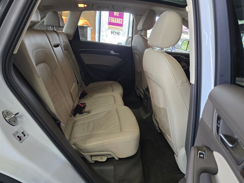 2013 Audi Q5 2.0T QUATRO PREMIUM PLUS --4DOOR SUV AWD -- AUTOMATIC TRANSMISSION -- BACKUP CAMERA -- PANORAMIC MOONROOF -- KEYLESS ENTRY -- ENGINE START -- LEATHER HEATED SEATS -- POWER WINDOWS AND MEMORY SEATS -- POWER LOCKS -- BLUETOOTH -- AUX - INPUT - USB -- POWER LIFTGATE -- ROOF RACK -- VERY CLEAN INSIDE AND OUT -- MOST OF OUR VEHICLES ARE HIGH QUALITY, HAND PICKED, ONE OWNER IN A LIKE NEW CONDITION WITH A CLEAN CAR FAX. MOST OF OUR VEHICLES ARE COVERED WITH THE MANUFACTURER WARRANTY OR A 3 MONTHS/4500 MILE WARRANTY. FINANCING IS AVAILABLE AND TRADES ARE ALWAYS WELCOMED. FOR SIMILAR GREAT DEALS PLEASE CONTACT US. -- INSTALLED FEATURES: Air filtration, Front air conditioning: automatic climate control, Front air conditioning zones: dual, Rear air conditioning: automatic climate control, Rear air conditioning zones: single, Airbag deactivation: occupant sensing passenger, Front airbags: dual, Side airbags: front, Side curtain airbags: front / rear, Antenna type: diversity, Auxiliary audio input: Bluetooth / iPod/iPhone / jack / USB, In-Dash CD: MP3 Playback / single disc, Radio: AM/FM, Satellite radio: SiriusXM, Speed sensitive volume control, Subwoofer: 1, Surround sound: 5.1, Total speakers: 9, Watts: 180, ABS: 4-wheel, Braking assist, Electronic brakeforce distribution, Electronic parking brake, Front brake type: ventilated disc, Rear brake type: disc, Armrests: rear center folding with pass-thru, Cargo area floor mat, Center console trim: alloy / wood, Dash trim: alloy / wood, Door sill trim: aluminum, Door trim: alloy / wood, Floor mat material: carpet, Floor material: carpet, Floor mats: front / rear, Interior accents: aluminum / woodgrain, Shift knob trim: leather, Steering wheel trim: leather, Ambient lighting, Assist handle: front / rear, Cargo area light, Cargo cover: hard, Center console: front console with armrest / illuminated, Cruise control, Cupholders: front / rear, Footwell lights, Memorized settings: 2 driver / driver seat / side mirrors, Multi-function remote: keyless entry / trunk release, One-touch windows: 2, Overhead console: front, Power outlet(s): 12V front / 12V rear / two 12V, Power steering: variable/speed-proportional, Reading lights: front / rear, Rearview mirror: auto-dimming, Steering wheel: tilt and telescopic, Steering wheel mounted controls: audio / cruise control / phone, Storage: cargo tie-down anchors and hooks / door pockets / front seatback, Universal remote transmitter: Homelink - garage door opener, Vanity mirrors: dual illuminating, Door handle color: body-color, Exhaust: dual tip, Exhaust tip color: polished aluminum, Front bumper color: body-color, Grille color: aluminum, Mirror color: body-color, Rear bumper color: body-color, Rear spoiler: roofline, Rear spoiler color: body-color, Rear trunk/liftgate: liftgate / power operated, Window trim: silver, Infotainment screen size: 6.5 in., Clock, Compass, External temperature display, Fuel economy display: MPG / range, Gauge: tachometer, Multi-function display, Trip odometer, Warnings and reminders: coolant temperature warning / lamp failure / low fuel level / low oil pressure, Daytime running lights: LED, Exterior entry lights: approach lamps, Front fog lights, Headlights: auto delay off / auto on / HID/Xenon / self-leveling, Rear fog lights, Taillights: LED, Side mirror adjustments: power / power folding, Side mirrors: auto-dimming / heated / integrated turn signals, 4WD type: full time, Alternator: 150 amps, Limited slip differential: center, Locking differential: front / rear, Moonroof / Sunroof: dual / power panoramic / sliding sunshade / tilt, Roof rails: silver, Child safety door locks, Child seat anchors: LATCH system, Crumple zones: front / rear, Impact sensor: door unlock / fuel cut-off / post-collision safety system, Front seatbelts: 3-point, Rear seatbelts: 3-point, Seatbelt force limiters: front, Seatbelt pretensioners: front / rear, Seatbelt warning sensor: front, Driver seat: heated, Driver seat power adjustments: 8 / height / lumbar, Front headrests: 2 / adjustable, Front seat type: bucket, Passenger seat: heated, Passenger seat manual adjustments: lumbar, Passenger seat power adjustments: 8 / height, Rear headrests: 3 / adjustable, Rear seat folding: split, Rear seat manual adjustments: reclining, Rear seat type: 40-20-40 split bench, Upholstery: premium leather, Anti-theft system: alarm / vehicle immobilizer, Power door locks: auto-locking, Hill holder control, Stability control, Traction control, Front shock type: gas, Front spring type: coil, Front stabilizer bar, Front struts, Front suspension classification: independent, Front suspension type: double ball joint, Rear shock type: gas, Rear spring type: coil, Rear stabilizer bar, Rear suspension classification: independent, Rear suspension type: multi-link, Wireless data link: Bluetooth, Trailer hitch: ready, Spare tire mount location: inside, Spare tire size: temporary, Spare wheel type: steel, Tire Pressure Monitoring System, Wheel spokes: 10, Wheels: aluminum alloy, Front wipers: rain sensing / variable intermittent, Heated windshield washer jets, Liftgate window: fixed, Power windows: safety reverse, Rear privacy glass, Rear wiper: with washer, Window defogger: rear
