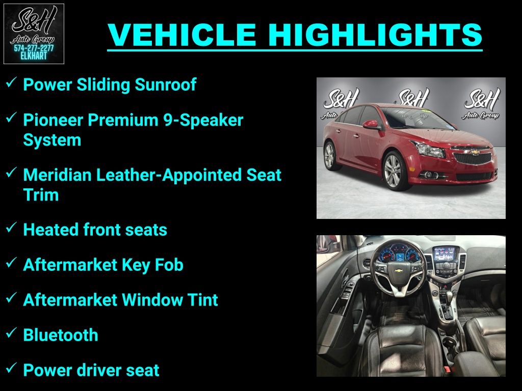 Priced below KBB Fair Purchase Price! Aftermarket Key Fob, Aftermarket Window Tint, Bluetooth, Center Dash Auxiliary Glovebox Delete, Emergency communication system: OnStar Directions & Connections, Exterior Parking Camera Rear, Heated front seats, Meridian Leather-Appointed Seat Trim, Pioneer Premium 9-Speaker System, Power driver seat, Power Sliding Sunroof. Crystal Red Tintcoat 2013 Chevrolet Cruze LTZ FWD FWD 6-Speed Automatic Electronic with Overdrive 4D Sedan ECOTEC 1.4L I4 SMPI DOHC Turbocharged VVT 26/38 City/Highway MPGAt S & H we pride ourselves on our OUTSTANDING CUSTOMER SERVICE, our TRANSPARENT SALES PROCESS and our ROCK BOTTOM PRICES! Odometer is 85554 miles below market average! 26/38 City/Highway MPGAwards: * 2013 IIHS Top Safety PickEnjoy the benefits of certified service near Mishawaka IN, South Bend IN, Niles MI and Edwardsburg MI at the S&H Motor Sales Service Center. If you're anything like us, you love the feeling of driving a preowned car, and you want your car to feel like new for years and years to come. Fortunately, one of the best ways to ensure that, and avoid costly repairs in the future is to keep up with your manufacturer-recommended maintenance. And with years of preowned service expertise under our belts here at S&H Motor Sales, there's no one better equipped to serve your car care needs than we are.Reviews: * Where some compacts feel light and flimsy, the 2013 Chevrolet Cruze exudes a feeling of solidity and strength. Those seeking maximum fuel economy will likely be impressed by the Eco models 42-mpg EPA highway figure. Source: KBB.com * Handsome interior design; Eco model's high fuel economy; useful electronics interface; secure handling; top safety scores; big trunk. Source: Edmunds