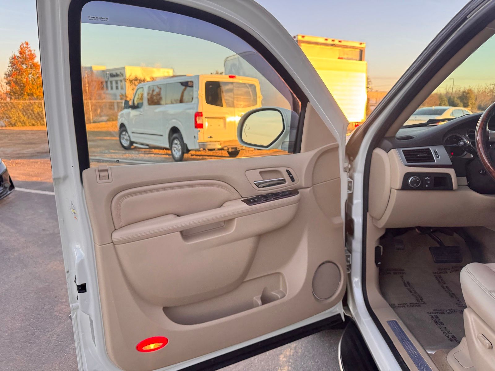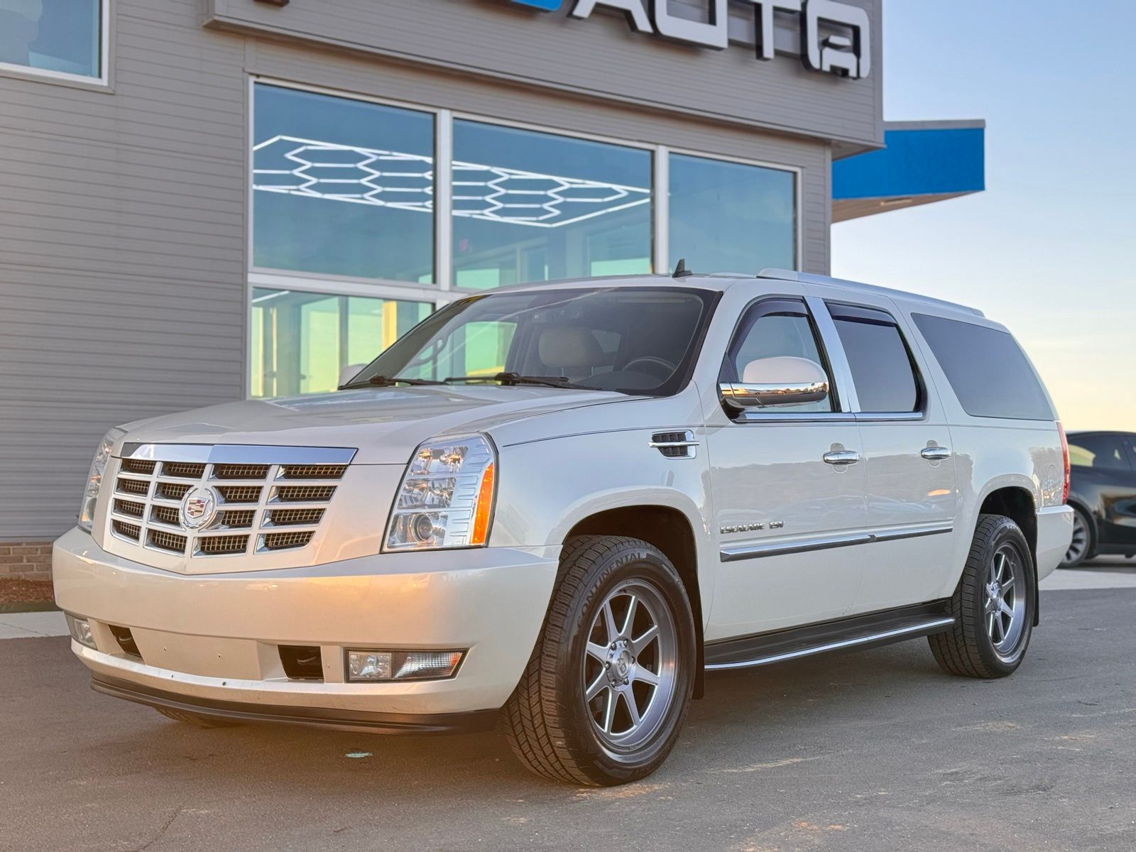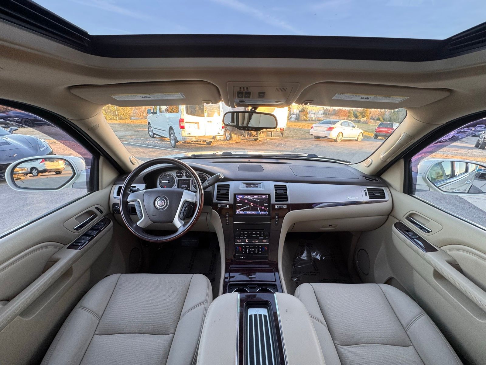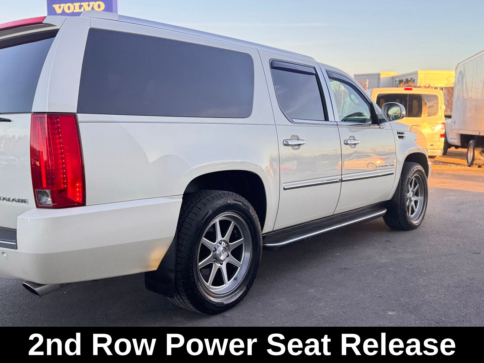 White Diamond Tricoat 2014 Cadillac Escalade ESV Luxury AWD 6-Speed Automatic HD Electronic with Overdrive Vortec 6.2L V8 SFI VVT AWD, 2nd Row Power Seat Release, Heated Steering Wheel, IntelliBeam Headlamps, Magnetic Ride Control Suspension Package, Navigation System, Power Tilt-Sliding Sunroof w/Express-Open/Close, Preferred Equipment Group 1SB, Side Blind Zone Alert.Magnetic Ride Control Suspension Package, Preferred Equipment Group 1SB (2nd Row Power Seat Release, Heated Steering Wheel, IntelliBeam Headlamps, Power Tilt-Sliding Sunroof w/Express-Open/Close, and Side Blind Zone Alert), AWD, Navigation System, 10 Speakers, 1st & 2nd Row All-Weather Floor Mats, 22 x 9 7-Spoke Chromed Aluminum Wheels, 3.42 Rear Axle Ratio, 3rd Row DVD Screen, 3rd row seats: split-bench, 4-Wheel Disc Brakes, ABS brakes, Adaptive suspension, Adjustable pedals, Air Conditioning, Alloy wheels, AM/FM radio: SiriusXM, AM/FM Stereo w/Navigation, Auto High-beam Headlights, Auto tilt-away steering wheel, Auto-dimming door mirrors, Auto-dimming Rear-View mirror, Auto-leveling suspension, Automatic temperature control, Bodyside moldings, Brake assist, Bumpers: body-color, CD player, Chrome Exhaust Tip, Chrome wheels, Compass, Delay-off headlights, Driver door bin, Driver vanity mirror, Dual front impact airbags, Dual front side impact airbags, DVD-Audio, Electronic Stability Control, Emergency communication system: OnStar Directions & Connections, Exterior Parking Camera Rear, Front anti-roll bar, Front Bucket Seats, Front Center Armrest w/Storage, Front dual zone A/C, Front fog lights, Front License Plate Bracket, Front reading lights, Front wheel independent suspension, Fully automatic headlights, Garage door transmitter, Heated & Cooled Front Bucket Seats, Heated door mirrors, Heated front seats, Heated rear seats, Heated steering wheel, High intensity discharge headlights: Xenon, Illuminated entry, Leather steering wheel, Low tire pressure warning, Memory seat, NavTraffic, Nuance Leather Seating Surfaces, Occupant sensing airbag, Outside temperature display, Overhead airbag, Overhead console, Panic alarm, Passenger door bin, Passenger vanity mirror, Pedal memory, Power door mirrors, Power driver seat, Power Liftgate, Power moonroof, Power passenger seat, Power steering, Power windows, Radio data system, Rear air conditioning, Rear anti-roll bar, Rear audio controls, Rear reading lights, Rear Seat Entertainment System, Rear window defroster, Rear window wiper, Remote keyless entry, Roof rack, Security system, SIRIUSXM Satellite Radio, Speed control, Split folding rear seat, Spoiler, Steering wheel memory, Steering wheel mounted audio controls, Tachometer, Tilt steering wheel, Traction control, Trip computer, Turn signal indicator mirrors, USB Port Audio System Feature, Variably intermittent wipers, and Ventilated front seats. Odometer is 29561 miles below market average!Reviews: * If you want to carry up to eight passengers and tow 8,300 pounds of toys with a boatload of style and amenities, the Escalade can do so with plenty of class. Source: KBB.com * Simultaneous cargo- and people-carrying ability; unique visual presence; long list of standard features; gutsy V8; composed ride. Source: Edmunds
