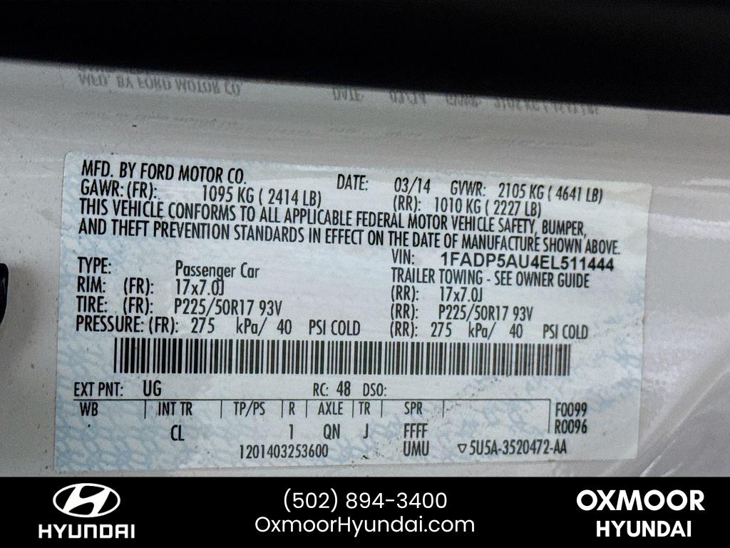 <b>Summary</b><br>***THIS VEHICLE IS LOCATED AT OXMOOR HYUNDAI (502)894-3400***<br><br>***THIS VEHICLE IS LOCATED AT OXMOOR HYUNDAI (502)894-3400***<br><br><b>Vehicle Details</b><br>Experience efficient driving with this 2014 Ford C-Max Hybrid SE' now available in Louisville' KY. Designed for drivers who want smart fuel economy without sacrificing comfort' this C-Max SE pairs a responsive 2.0L 4-cylinder Full Hybrid Electric (FHEV) powertrain with front-wheel drive to deliver smooth performance and exceptional mileage for daily commutes and longer trips. Its compact hatchback form provides versatile cargo space and confident city maneuverability' while the hybrid system reduces fuel stops and emissions.<br><br>Inside' you'll find a practical cabin with comfortable seating' intuitive controls' and modern conveniences that make every drive more enjoyable. Standard SE features enhance safety and convenience' including advanced airbag systems' stability control' and a user-friendly infotainment interface that keeps connected on the go. Well-maintained and inspected' this C-Max offers reliable hybrid technology and a proven track record for longevity.<br><br>Located in Louisville' KY' this 2014 Ford C-Max Hybrid SE is competitively priced to be the best value in the area. Whether you're seeking economical daily transportation or a dependable secondary vehicle' this C-Max stands out for efficiency' functionality' and affordability. Contact us to schedule a test drive and experience why this Ford C-Max Hybrid SE represents the best price and smart choice for hybrid buyers in Louisville.<br><br><b>Additional Information</b><br>***THIS VEHICLE IS LOCATED AT OXMOOR HYUNDAI (502)894-3400***<br><br>It is your responsibility to address any differences between information on this label and the actual vehicle specifications' and/or any warranties offered before the sale of this vehicle. Vehicle data on this label is compiled from publicly available sources' the publisher believes to be reliable. Vehicle data may change without notice. The publisher assumes no responsibility for errors and/or omissions in this data' the compilation of this data or sticker placement' and makes no representations express or implied to any actual or perspective purchaser of the vehicle as to the condition of the vehicle' vehicle specifications' ownership' vehicle history' equipment/asscessories' price or warranties. Actual mileage may vary.