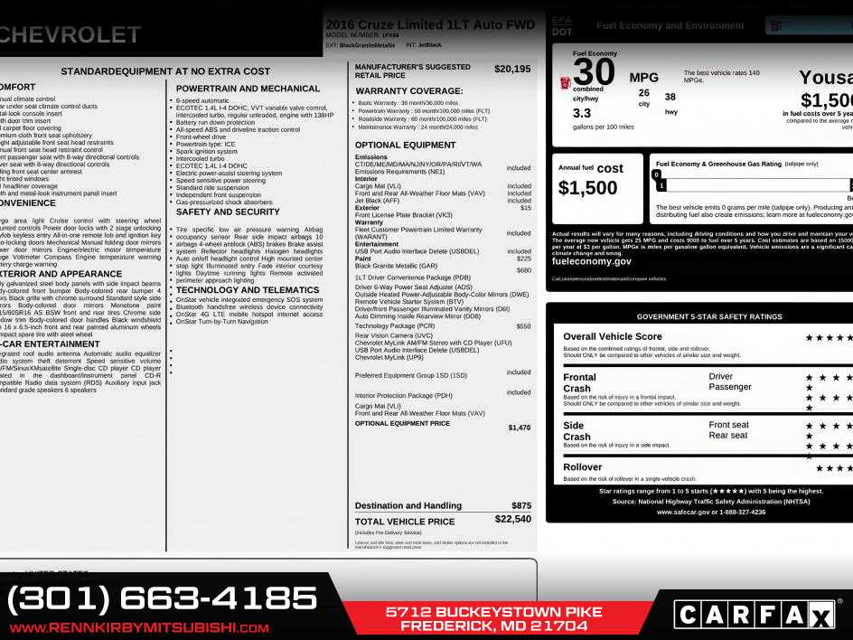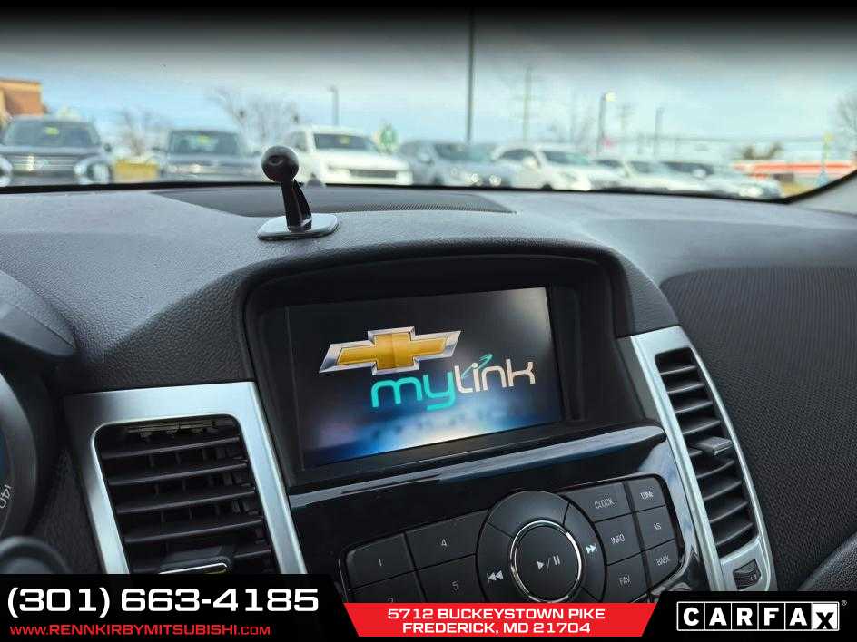 Extra Clean. FUEL EFFICIENT 38 MPG Hwy/26 MPG City! WiFi Hotspot, Onboard Communications System, Satellite Radio, Alloy Wheels, ENGINE, ECOTEC TURBO 1.4L VARIABLE VALVE TIMING DOHC 4-CYLINDER SEQUENTIAL MFI, 1LT DRIVER CONVENIENCE PACKAGE <br /><br />EXCELLENT SAFETY FOR YOUR FAMILY<br />Child Safety Locks, Electronic Stability Control, 4-Wheel ABS, Front Disc/Rear Drum Brakes Safety equipment includes Child Safety Locks Chevrolet LT with Black Granite Metallic exterior and Jet Black interior features a 4 Cylinder Engine with 138 HP at 4900 RPM*. <br /><br />AFFORDABILITY<br />Reduced from $8,420. This Cruze Limited is priced $1,200 below J.D. Power Retail. <br /><br />VEHICLE FEATURES<br />Maryland State Inspected <br /><br />OPTION PACKAGES<br />includes (ADS) driver 6-way power seat adjuster with manual recliner, (D6I) driver and front passenger illuminated vanity mirrors, (DD8) auto-dimming inside rearview mirror and (DWE) outside heated, power-adjustable mirrors, includes (UFU) Chevrolet MyLink radio, (UP9) Chevrolet MyLink and (UVC) Rear Vision Camera, REMOTE VEHICLE STARTER SYSTEM, (138 hp [103 kW] @ 4900 rpm, 148 lb-ft of torque [199.8 N-m] @ 1850 rpm), TRANSMISSION, 6-SPEED AUTOMATIC, ELECTRONICALLY CONTROLLED WITH OVERDRIVE, AM/FM stereo with CD player and MP3 playback, includes 7 diagonal color touch-screen display. Extra Clean <br /><br />EXPERTS RAVE<br />The Cruze Limiteds cabin has a classy two-tone color scheme and looks more upscale than many of its competitors. -Edmunds.com. Great Gas Mileage: 38 MPG Hwy. <br /><br />BUY FROM AN AWARD WINNING DEALER<br />Thank you for Choosing Renn Kirby Mitsubishi, where we care about you! We offer the finest selection of new and used vehicles in all of Frederick, MD. <br /><br />New vehicle pricing includes all applicable Mitsubishi rebates. See dealer website for complete descriptions of available rebates to determine eligibility. Tax, registration fees, destination/freight charges, Environmental Protection Package, and the $795 dealer doc fee are not included in the advertised price. Dealer-installed options are also excluded from online pricing. A discount of $500 for a trade-in and $500 for financing through the dealership are included in the advertised price. Please speak with a Sales Expert for complete pricing details. See the vehicle display on www.rennkirbymitsubishi.com for full details.<br />