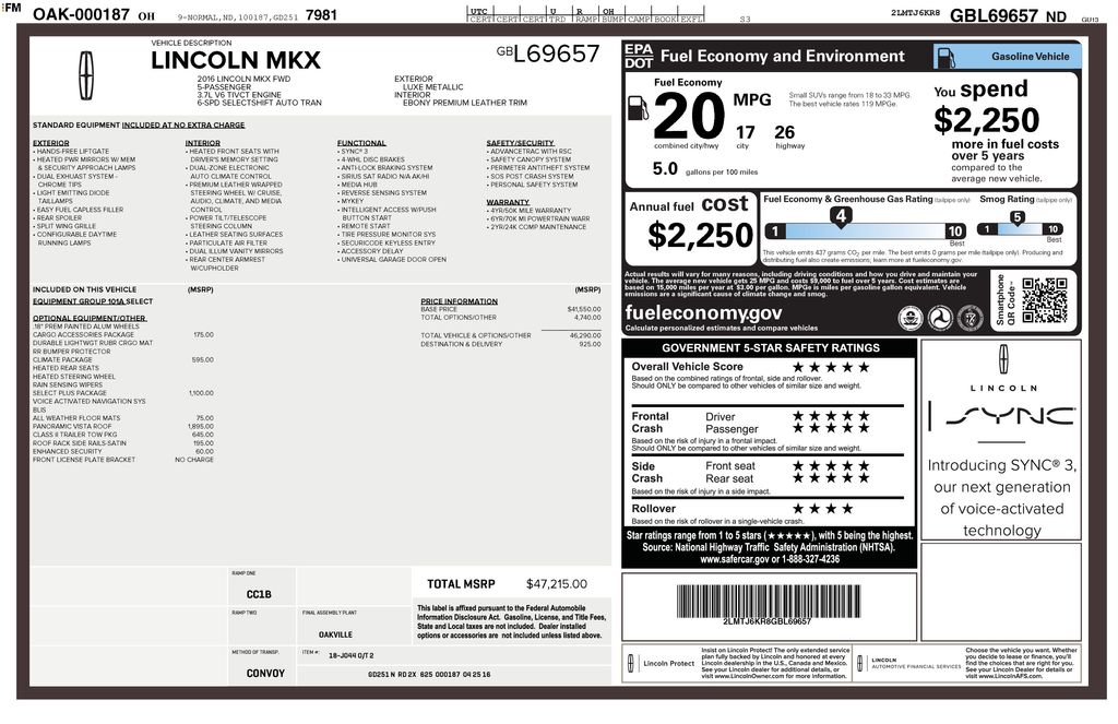 2016 Lincoln MKX Select Luxe MetallicRecent Arrival! 17/26 City/Highway MPGOutstanding features on this MKX include..*Voice Activated Navigation System, Panoramic Vista Roof w/Power Shades, Select Plus Package, Equipment Group 101A, Accessories Package, Class II Trailer Tow Package (3500 lbs), Climate Package, Enhanced Security Package, 10 Speakers, 18 Premium Painted Aluminum Wheels, 4-Wheel Disc Brakes, 8 LCD Touch Screen, AM/FM radio: SiriusXM Satellite Radio, Auto High-Beam Headlamps, Automatic Rain-Sensing Wipers, Backup Camera, BLIS Blind Spot Information System, Cruise control, Driver vanity mirror, Front Bucket Seats, Front dual zone A/C, Heated front seats, Heated Rear Seats, Heated Steering Wheel, Lockable Interior Storage, Low tire pressure warning, Memory seat, Passenger vanity mirror, Power Heated door mirrors, Power Liftgate, Premium Leather-Trimmed Heated Bucket Seats (AE), Rear Bumper Anti-Scratch Pad/Load Protector, Remote Keyless Entry, Satin Roof Rack Side Rails Without Crossbars, Steering wheel mounted A/C controls, Steering wheel mounted audio controls, SYNC 3, Tilt and Telescoping steering wheel, Traction control.Awards: * 2016 IIHS Top Safety Pick+ * 2016 KBB.com Best Buy Awards FinalistDAVE ARBOGAST IS ONE OF THE TOP 100 FRANCHISE USED CAR DEALERS IN THE USA! Come find out why! Visit www.davearbogast.com for more photos! At Dave Arbogast we carry all makes and models and have vehicles in all different colors. Our Pre-owned Vehicles could have some of the following features but not be listed: Memory package, off road package, premium package, premium sound package, remote vehicle starter prep package, skid plate package, solid smooth ride suspension package, sound package, sport package, steel wheels, suspension package, z71 package, 3rd row seat, Bluetooth, hands-free, cd player, cruise control, dvd player. Keyless entry, lift kit, multi-zone climate control, navigation, portable audio connection, power locks, power windows, premium audio, security system, steering wheel controls, sunroof, trailer hitch, apple carplay/android auto, brake assist, homelink, memory seat, stability control, android auto, apple carplay, alloy wheels, aluminum wheels, backup camera, Bluetooth, cargo package, chrome wheels, convenience package, leather seats, navigation system, power package, remote start, se package, safety package, sunroof/moonroof, tow package, adaptive cruise control, comfort package, tow package, trailer package, appearance package, cargo package, power package, safety package, acoustical package, dvd entertainment system, preferred package, technology package, driver confidence package, audio package, and heat package. *See Dealer For Specific Equipment* Dealer Disclosure: Sales Tax, Title, License Fee, Registration Fee, $387 Dealer Documentary Fee are additional to the advertised price.
