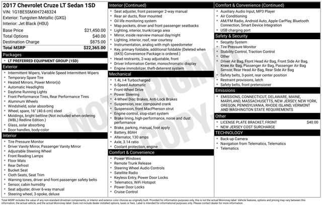 *2017 Chevrolet Cruze Tungsten Metallic*AM/FM radio: SiriusXM*Apple CarPlay/Android Auto*Rear camera*Heated door mirrors*Remote keyless entry*Clean CARFAX*Fuel Economy: 30/40 City/Highway MPG *Performance for All Your AdventuresUnder the hood lies a 1.4L Turbo DOHC 4-Cyl DI Engine that churns out a spirited 153 horsepower. This power, paired with a 6-speed automatic transmission, ensures a smooth and responsive drive across Ohio's varied landscapes. The front-wheel drive system and independent front suspension are perfect for navigating through seasonal changes, from snowy winters to sunny summer road trips. Glide effortlessly with the stylish 16-inch aluminum wheels, which add a touch of elegance to your commute.*Smart Technology for Everyday ConvenienceStay seamlessly connected with the Chevrolet MyLink Radio and its intuitive 7-inch touchscreen. Integrate your smartphone with Apple CarPlay and Android Auto, making it easy to access navigation, stream your favorite playlists, or connect with friends on the go. Plus, the OnStar 4G LTE mobile hotspot means you're never out of touch, even when venturing into the more secluded areas of Ohio for a weekend getaway.*Safety and Comfort, RedefinedSafety is a priority with features like automatic emergency braking, stability control, and a comprehensive 10-airbag system. These are complemented by a rearview camera that makes parking in tight spots a breeze, while LED daytime running lights ensure you're visible in all conditions. Inside, enjoy the comfort of jet black cloth seats and the practicality of 60-40 split-folding rear seats, which provide flexibility whether you're hauling sports gear for a day at the park or loading groceries.EXPERTISE YOU CAN TRUST! At Ken Ganley Kia Boardman, we offer more than just vehicles; we provide a comprehensive car-buying experience backed by a team of Kia-certified sales experts. Our staff is dedicated to guiding you through every step of the process, ensuring you make informed decisions with confidence. Our service team, comprised of ASE Certified and Kia Master technicians, guarantees that every vehicle is maintained to the highest standards, providing you with peace of mind long after your purchase.UNPARALLELED CUSTOMER CARE! Our commitment to exceptional customer service extends beyond the sale. From the moment you enter our dealership, you become part of the Ken Ganley Kia family. We offer convenient service options, including Saturday hours, evening pickups and drop-offs, service shuttles, and loaner vehicles, to accommodate your busy lifestyle. Our goal is to build lasting relationships and ensure your satisfaction at every turn. At Ken Ganley Kia Boardman, you're not just buying a car; you're gaining a partner in your automotive journey.Awards: * 2017 KBB.com 10 Most Awarded BrandsReviews: * Cabin is attractive, especially with the two-tone color scheme; lots of rear-seat legroom; fuel-sipping diesel-engine upgrade available; plenty of appealing convenience and technology features are offered. Source: Edmunds * Cabin is attractive, especially with the two-tone color scheme; lots of rear seat legroom; plenty of appealing convenience and technology features are offered. Source: Edmunds