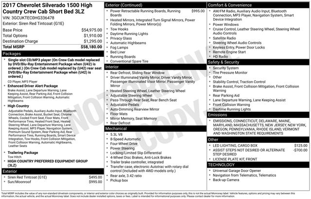 Discover the ultimate in power, style, and comfort with this 2017 Chevrolet Silverado 1500 High Country. This exceptional full-size pickup boasts a commanding presence on the road, blending rugged capability with refined luxury. Meticulously maintained and brimming with an impressive array of features, this Silverado is the perfect companion for your next adventure.Standout highlights include: Power-retractable assist steps with foot-activated control Siren Red Tintcoat exterior with LED cargo box lighting Bose premium audio system with 7 speakers Dual-zone automatic climate control and heated steering wheel Leather-appointed, heated and ventilated front seats Integrated trailer brake controller and 4.2-inch driver information displayThe Silverado's EcoTec3 5.3L V8 engine, paired with an 8-speed automatic transmission, delivers a potent combination of power and efficiency, with an impressive 20 MPG on the highway. Whether you're towing a heavy load, navigating rough terrain, or simply enjoying the open road, this Silverado is up to the task.Elevate your driving experience with the advanced safety and technology features, including Forward Collision Alert, Lane Keep Assist, and the convenient Wireless Charging. The Chevrolet MyLink infotainment system with an 8-inch color touch screen puts a world of connectivity and entertainment at your fingertips.Meticulously cared for and ready to impress, this 2017 Chevrolet Silverado 1500 High Country is a must-see. Experience the perfect blend of capability, luxury, and innovation that only a Silverado can deliver. Contact us today to schedule a test drive and discover why this exceptional truck should be your next ride.
