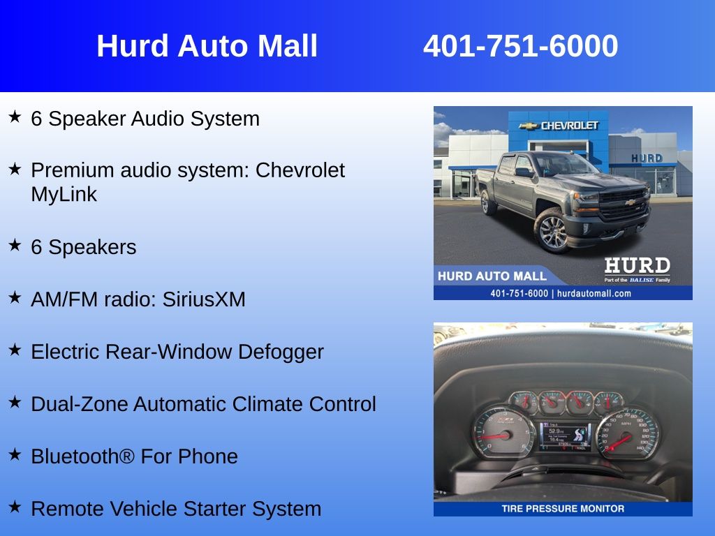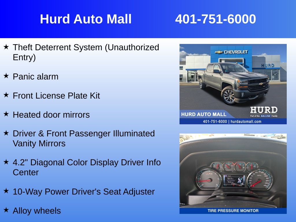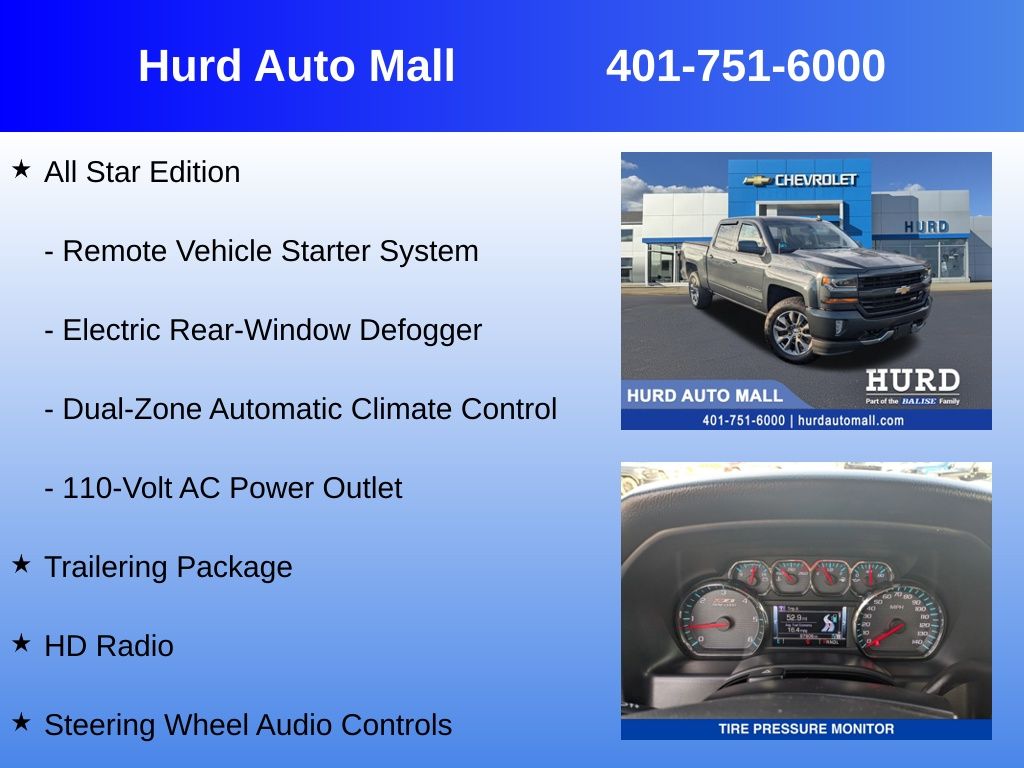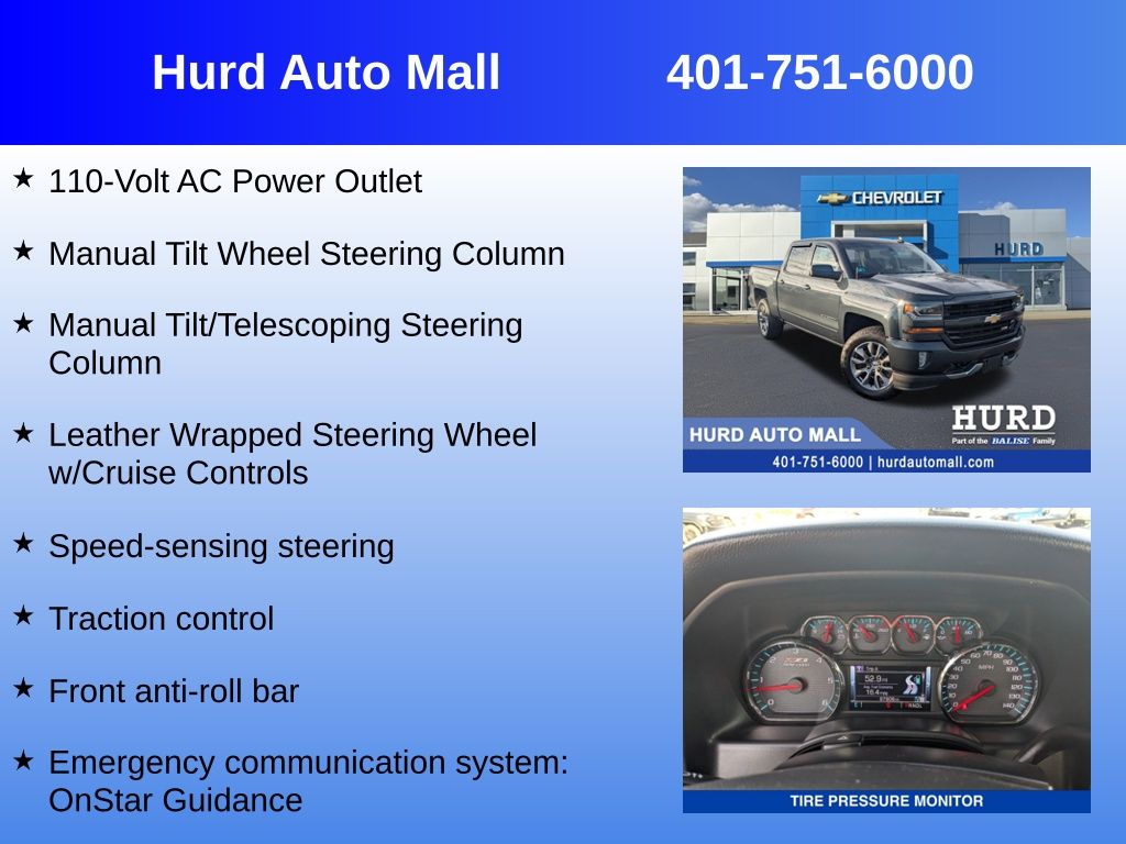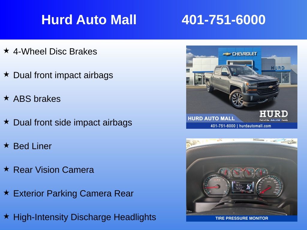 At Hurd Auto Mall, proudly part of the Balise Family, we have been honored to serve the Rhode Island community for over 85 years, offering exceptional customer service in a family-oriented environment. As part of the trusted Balise group, we continue to deliver the highest standards of excellence and satisfaction.6-Speed Automatic Electronic with Overdrive, 4WD, Black Cloth, 10-Way Power Driver's Seat Adjuster, 110-Volt AC Power Outlet, 4-Wheel Disc Brakes, 4.2 Diagonal Color Display Driver Info Center, 6 Speaker Audio System, 6 Speakers, 6 Rectangular Chromed Tubular Assist Steps, ABS brakes, All Star Edition, Alloy wheels, AM/FM radio: SiriusXM, Bed Liner, Bluetooth For Phone, Driver & Front Passenger Illuminated Vanity Mirrors, Dual front impact airbags, Dual front side impact airbags, Dual-Zone Automatic Climate Control, Electric Rear-Window Defogger, Emergency communication system: OnStar Guidance, Exterior Parking Camera Rear, Front anti-roll bar, Front License Plate Kit, HD Radio, Heated door mirrors, High-Intensity Discharge Headlights, Leather Wrapped Steering Wheel w/Cruise Controls, Manual Tilt Wheel Steering Column, Manual Tilt/Telescoping Steering Column, Panic alarm, Premium audio system: Chevrolet MyLink, Rear Vision Camera, Remote Vehicle Starter System, Speed-sensing steering, Steering Wheel Audio Controls, Theft Deterrent System (Unauthorized Entry), Traction control, Trailering Package. Priced below KBB Fair Purchase Price!Odometer is 12025 miles below market average!Awards: * 2017 KBB.com 10 Most Awarded Brands