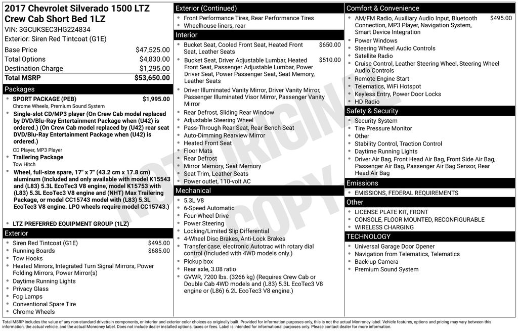 Discover unmatched choice at Westgate Chrysler Jeep Dodge Ram in Raleigh, home to a huge lineup of new vehicles and one of the largest used-car inventories on the east coast with 1,000+ options ready to drive.This 2017 Chevrolet Silverado 1500 LTZ 1LZ comes equipped with a remarkable array of premium features, including:Clean Carfax!!! SPORT PACKAGE with 20 chrome wheels and Bose sound system Heated and vented perforated leather-appointed front bucket seats Chevrolet MyLink Radio with 8 color touchscreen, navigation, and wireless chargingThe powerful EcoTec3 5.3L V8 engine and 4-wheel drive deliver exceptional performance and capability, while the Trailering Package ensures you can tow with confidence. Enjoy the convenience of remote vehicle start, dual-zone automatic climate control, and a rear-window defogger.This Silverado's sleek Siren Red Tintcoat exterior is complemented by chrome exterior accents, including the bumpers, door handles, and mirror caps. The cabin boasts premium leather seating, a Bose sound system, and a host of advanced technology features that elevate the driving experience.Whether you're hauling heavy loads, embarking on off-road adventures, or simply seeking a refined and capable full-size truck, this 2017 Chevrolet Silverado 1500 LTZ 1LZ is an exceptional choice. With its impressive performance, premium amenities, and striking good looks, this Silverado is sure to impress.We invite you to experience the unparalleled quality and craftsmanship of this exceptional Silverado. Visit Westgate Chrysler Jeep Dodge Ram in Raleigh, where our knowledgeable sales team is ready to assist you in finding the perfect vehicle to meet your needs.Choose Westgate Chrysler Jeep Dodge Ram in Raleigh, NC for a dealership experience built on transparency, value, and customer-first service. With a wide selection of new CJDR models and an extensive inventory of quality used cars, trucks, and SUVs, Westgate is a trusted destination for shoppers across Raleigh, Durham, the Triangle and all of North Carolina.
