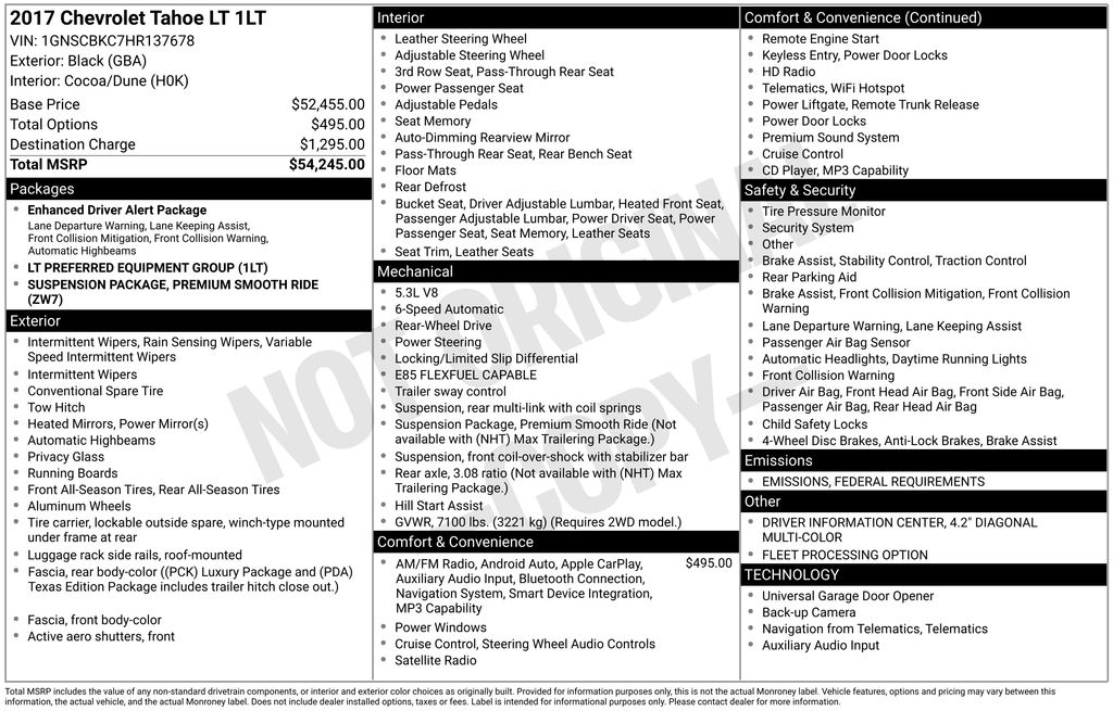 If you are looking for basic, affordable transportation, then this car is for you! All Pre-Auction vehicles are sold As Is; and have not addressed any mechanical or cosmetic repairs, all to keep the price of this vehicle as low as possible as if you were at the auction yourself. There is absolutely no warranty with this car. Dealer assumes no responsibility for any issues after sale. Call us to get additional information, schedule a test drive or just stop on by. But hurry, as at this price this vehicle will not last long. Clean CARFAX.Tahoe LT, Cocoa/Dune Leather, 1st & 2nd Row Color-Keyed Carpeted Floor Mats, 2nd Row 60/40 Split-Folding Manual Bench, 3rd Row Manual 60/40 Split-Folding Fold Flat Bench, 4-Wheel Antilock Disc Brakes w/Brake Assist, Auto-Dimming Inside Rear-View Mirror, Black Assist Steps, Bose Premium 9-Speaker System, Color-Keyed Carpeting Floor Covering, Driver Inboard & Front Passenger Airbags, Electronic Cruise Control w/Set & Resume Speed, Enhanced Driver Alert Package (Y86), Enhanced Driver Information Center, Extended-Range Remote Keyless Entry, Floor Console, Forward Collision Alert Sensor Indicator, IntelliBeam Headlamps, Lane Keep Assist, Leather-Wrapped Steering Wheel, Low Speed Forward Automatic Braking, Memory Settings, OnStar Basic Plan For 5 Years, Power Liftgate, Power-Adjustable Accelerator & Brake Pedals, Preferred Equipment Group 1LT, Premium Smooth Ride Suspension Package, Rear Park Assist w/Audible Warning, Remote Vehicle Start, Roof-Mounted Luggage Rack Side Rails, SiriusXM Satellite Radio, Universal Home Remote.Black 2017 Chevrolet Tahoe LT RWD 6-Speed Automatic Electronic with Overdrive EcoTec3 5.3L V8*RK Processing Fee* Internet prices do not include $999.00 Processing Fee, DMV Fees or any applicable taxes. New vehicle internet prices also do not include any add on equipment and/or BUYER SELECTED suspension lift, body lift, any truck body (for commercial vehicles), custom wheels, custom tires, custom paint or other similar aftermarket products (either depicted or not depicted on website) on these specialty items, which can be added to a vehicle. While every attempt has been made to ensure the accuracy of the data displayed, the dealership is NOT RESPONSIBLE for any errors or omissions. RK relies on third party companies to display the pricing and technical specifications. Technology glitches can cause the incorrect information to display and the dealership is not responsible for the resulting errors. Must present internet ad prior to sales for ad price. These prices are not to be combined with any other RK offers. See a manager for more details. The results of this calculator should only be used as an estimate. Actual financing plans require more complex calculations than the simple compounded interest used in this program.Awards: * JD Power Automotive Performance, Execution and Layout (APEAL) Study, Dependability Study * 2017 KBB.com 5-Year Cost to Own Awards * 2017 KBB.com Best Buy Awards * 2017 KBB.com 12 Best Family Cars * 2017 KBB.com 10 Most Awarded BrandsReviews: * Seating for up to nine passengers; standard V8 engine assures plenty of passing power and a substantial tow rating; nicely trimmed cabin is one of the best in the class; available two-speed transfer case gives the Tahoe better than average off-road capabilities. Source: Edmunds