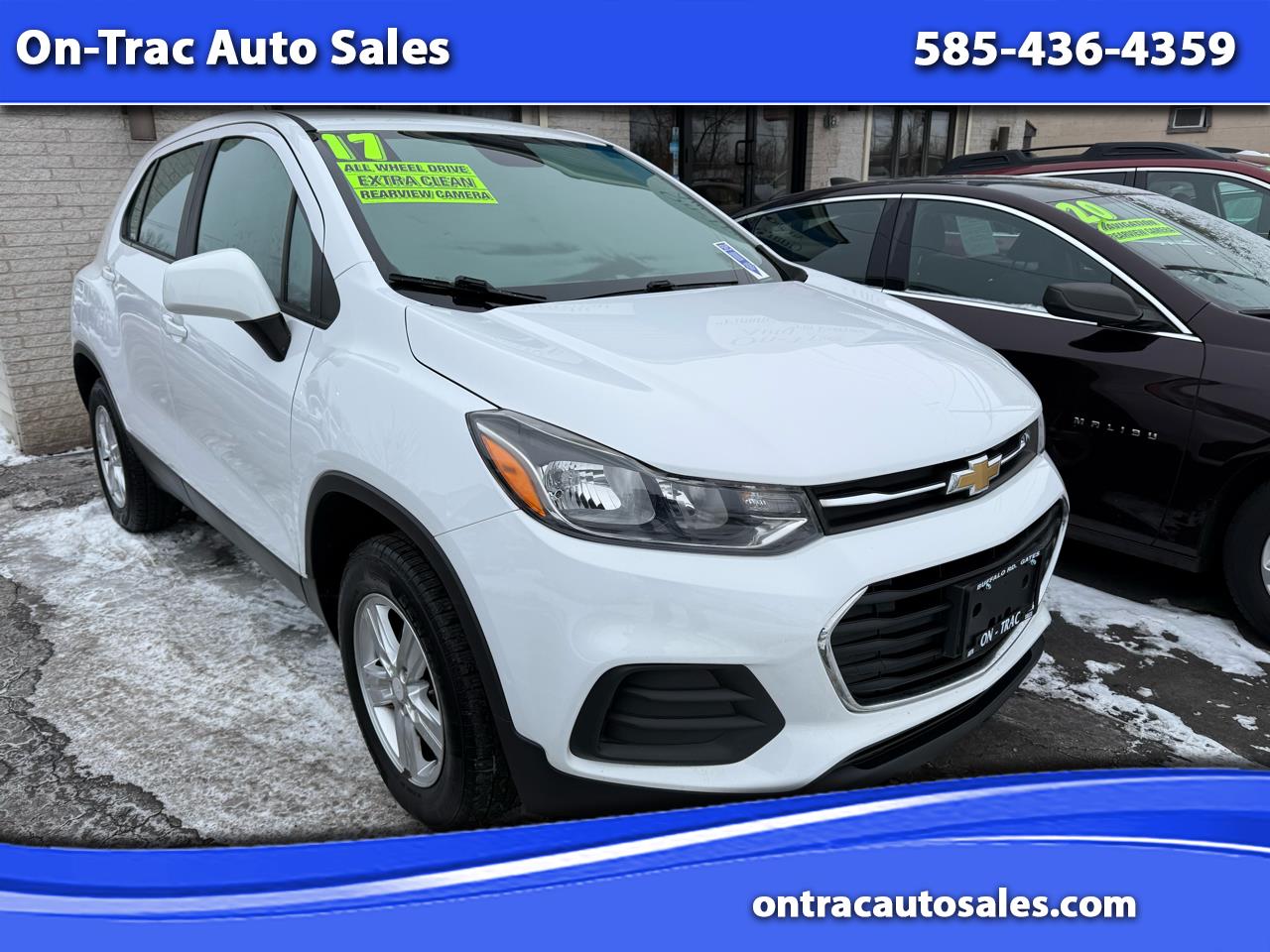 Hop into this zippy 2017 Chevrolet Trax and get ready for a thrilling ride! With its powerful ECOTEC Turbo 1.4L engine under the hood and all-wheel drive capability, this compact SUV is ready to take on any adventure. The sleek white exterior is accented by 16 aluminum wheels and sculpted tail lamps that will turn heads wherever you go. Step inside to find a comfortable cabin with all the essentials, from the 6-speaker audio system to the manual tilt and telescoping steering wheel. Stay connected on the go with steering wheel-mounted audio controls and the 3.5 monochrome Driver Information Center. Safety features like StabiliTrak stability control and a Rear Vision Camera provide peace of mind on every journey. Plus, with power windows, air conditioning, and rear heater ducts, you'll stay comfortable no matter the weather. This Chevrolet Trax is the perfect blend of style, performance, and practicality - making it a top choice for your next ride! Visit On-Trac Auto Sales online at ontracautosales.com to see more pictures of this vehicle or call us at 585-436-4359 today to schedule your test drive.