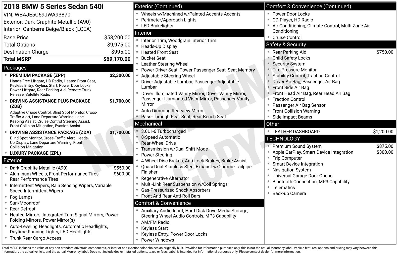 Dark Graphite 2018 BMW 5 Series 540i RWD 8-Speed Automatic 3.0L I6 Turbocharged DOHC 24V LEV3-ULEV70 335hp bowers and wilkins sound system, Canberra Beige/Black Canberra Beg/Blk Dak Cont Stic, Active Blind Spot Detection, Active Driving Assistant, Active Driving Assistant Plus, Apple CarPlay Compatibility, Dakota Leather Upholstery, Driving Assistance Package, Driving Assistance Plus Package, Head-Up Display, Lane Departure Warning System, Luxury Line, Luxury Package, Power moonroof, Power Tailgate, Wheels: 19 x 8 V-Spoke (Style 635).Driving Assistance Package (Active Blind Spot Detection, Active Driving Assistant, Head-Up Display, and Lane Departure Warning System), Driving Assistance Plus Package (Active Driving Assistant Plus), Luxury Package (Luxury Line), Canberra Beige/Black Canberra Beg/Blk Dak Cont Stic, Apple CarPlay Compatibility, Dakota Leather Upholstery, Power moonroof, Power Tailgate, Wheels: 19 x 8 V-Spoke (Style 635), 12 Speakers, 4-Wheel Disc Brakes, ABS brakes, Air Conditioning, Alloy wheels, AM/FM radio, Auto tilt-away steering wheel, Auto-dimming door mirrors, Auto-dimming Rear-View mirror, Automatic temperature control, Brake assist, Bumpers: body-color, CD player, Comfort Access Keyless Entry, Delay-off headlights, Driver door bin, Driver vanity mirror, Dual front impact airbags, Dual front side impact airbags, Electronic Stability Control, Emergency communication system: BMW Assist eCall, Enhanced USB & Bluetooth, Exterior Parking Camera Rear, Four wheel independent suspension, Front anti-roll bar, Front Bucket Seats, Front Center Armrest, Front dual zone A/C, Front fog lights, Front reading lights, Fully automatic headlights, Garage door transmitter, Genuine wood console insert, Genuine wood dashboard insert, Genuine wood door panel insert, Gesture Control, harman/kardon Surround Sound System, Heated door mirrors, Heated Front Seats, HiFi Sound System, Illuminated entry, In-Dash CD Player, Leather Dashboard, Leather Shift Knob, Leather steering wheel, Low tire pressure warning, Lumbar Support, Memory seat, Navigation System, Occupant sensing airbag, Outside temperature display, Overhead airbag, Panic alarm, Park Distance Control, Passenger door bin, Passenger vanity mirror, Power door mirrors, Power driver seat, Power Front Seats, Power passenger seat, Power steering, Power windows, Radio data system, Radio: AM/FM Audio System, Rain sensing wipers, Rear anti-roll bar, Rear reading lights, Rear seat center armrest, Rear window defroster, Remote keyless entry, Security system, SiriusXM Satellite Radio, Speed control, Speed-sensing steering, Speed-Sensitive Wipers, Split folding rear seat, Sport Seats, Sport steering wheel, Steering wheel memory, Steering wheel mounted audio controls, Tachometer, Telescoping steering wheel, Tilt steering wheel, Traction control, Trip computer, Turn signal indicator mirrors, Variably intermittent wipers, Wheels: 18 x 8 Double-Spoke (Style 634), and WiFi Hotspot. 21/30 City/Highway MPG