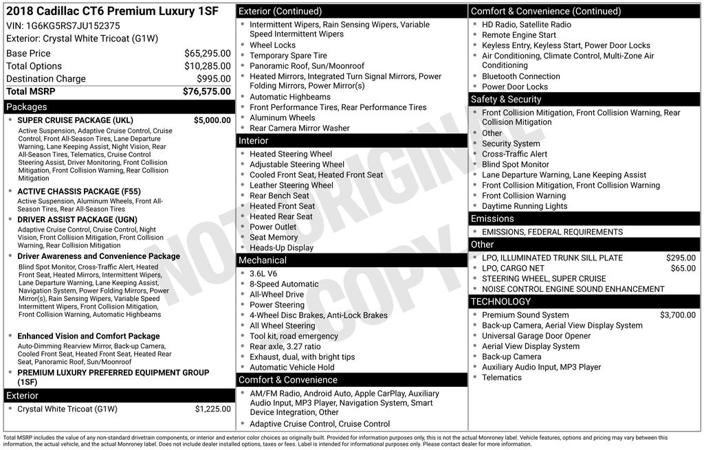 Discover unmatched choice at Westgate Chrysler Jeep Dodge Ram in Raleigh, home to a huge lineup of new vehicles and one of the largest used-car inventories on the east coast with 1,000+ options ready to drive.This stunning 2018 Cadillac CT6 3.6L Premium Luxury comes loaded with an impressive array of premium features, including:CLEAN CARFAX SUPER CRUISE PACKAGE BOSE PANARAY SOUND SYSTEM with 34 SPEAKERS Crystal White Tricoat exterior Illuminated trunk sill plate and cargo netThe CT6's powerful 3.6L V6 engine and advanced all-wheel drive system deliver an exceptional driving experience, with an EPA-estimated 27 MPG on the highway. Inside, you'll enjoy the comfort and convenience of features like heated and ventilated front seats, a heated steering wheel, and a Heads-Up Display that puts vital information right in your line of sight.This Cadillac also comes equipped with the latest advanced safety and driver assistance technologies, including Super Cruise, Adaptive Cruise Control, Forward/Reverse Automatic Braking, and Night Vision. With its sleek, sophisticated styling and cutting-edge capabilities, the CT6 is a true flagship luxury sedan that will turn heads wherever you go.With just 48,073 miles on the odometer, this well-maintained Cadillac CT6 represents an exceptional value. Imagine the joy of piloting this stunning, feature-rich sedan and experiencing its effortless performance and refined comfort every time you get behind the wheel.Don't miss your chance to make this impressive Cadillac CT6 your own. Visit Westgate Chrysler Jeep Dodge Ram in Raleigh today and let our knowledgeable sales team guide you through a personalized test drive. We're confident you'll be impressed by the unparalleled quality and value of this exceptional luxury sedan.Choose Westgate Chrysler Jeep Dodge Ram in Raleigh, NC for a dealership experience built on transparency, value, and customer-first service. With a wide selection of new CJDR models and an extensive inventory of quality used cars, trucks, and SUVs, Westgate is a trusted destination for shoppers across Raleigh, Durham, the Triangle and all of North Carolina.