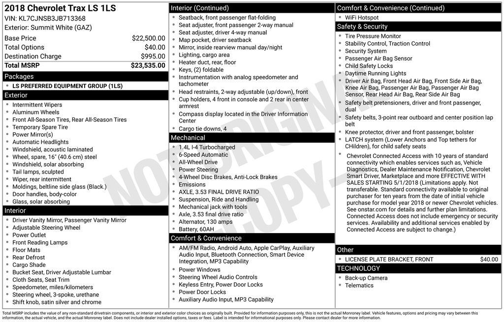 Discover the perfect balance of style, performance, and versatility in this 2018 Chevrolet Trax LS. With its sleek white exterior and powerful ECOTEC 1.4L I4 SMPI DOHC Turbocharged VVT engine, this compact SUV is ready to take on your daily adventures with confidence and efficiency. Key features include: License Plate Bracket, Front 6-Speaker Audio System Feature Radio: Chevrolet MyLink Audio System Rear Window Defroster Steering Wheel Mounted Audio Controls Brake Assist Exterior Parking Camera Rear Fully Automatic Headlights Power Door Mirrors 2 USB Ports with Auxiliary Input Jack Apple CarPlay/Android AutoBoasting an impressive 24 city/30 highway MPG, the Trax LS offers the perfect blend of power and efficiency to keep you moving. Its all-wheel drive capability ensures confident handling in a variety of road conditions, while the 6-speed automatic transmission provides smooth, responsive acceleration.Inside, the Trax LS surrounds you with premium features designed for your comfort and convenience. Enjoy the convenience of the Chevrolet MyLink infotainment system, which seamlessly integrates with your smartphone for hands-free calling, music streaming, and navigation. The spacious interior provides ample room for passengers and cargo, with a split-folding rear seat that offers versatile storage options.Safety is a top priority in the Trax LS, with a comprehensive suite of advanced driver-assistance technologies. From the Rear Vision Camera to the Stabilitrak Electronic Stability Control System, you can drive with confidence, knowing you and your loved ones are well-protected.This 2018 Chevrolet Trax LS is an exceptional value, offering the perfect blend of style, capability, and technology. With its low mileage and well-equipped interior, it's the ideal choice for the savvy buyer seeking a reliable and versatile compact SUV. Experience the difference for yourself schedule a test drive today and discover the joy of driving the Trax LS.