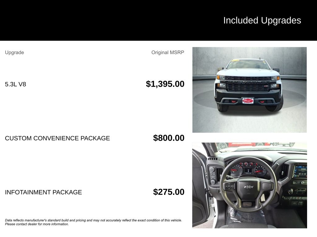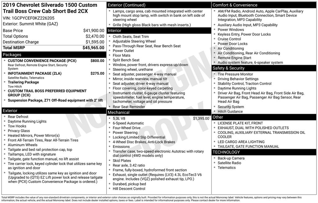 Discover the ultimate off-road companion in the 2019 Chevrolet Silverado 1500 Custom Trail Boss. This rugged and capable truck is ready to take on any adventure, whether you're tackling the toughest terrain or navigating the urban jungle.Packed with an impressive array of features, the Silverado 1500 Custom Trail Boss is the perfect blend of power and versatility. Boasting a potent EcoTec3 5.3L V8 engine, this truck delivers exceptional performance, with 285 horsepower and 305 lb-ft of torque at your command. Paired with a 6-speed automatic transmission and a robust 4-wheel drive system, the Silverado 1500 Custom Trail Boss is ready to conquer any challenge. Custom Convenience Package Infotainment Package Preferred Equipment Group 2CX Suspension Package Trailering Package SiriusXM Radio Electric Rear-Window Defogger Bluetooth for Phone EZ Lift Power Lock & Release Tailgate Remote Vehicle Starter System Hill Descent Control Heavy-Duty Rear Locking Differential LED Cargo Area Lighting Off-Road Suspension with 2 Lift Apple CarPlay/Android AutoExperience the ultimate in off-road capability with the Silverado 1500 Custom Trail Boss. With its impressive performance, advanced technology, and rugged good looks, this truck is ready to take on any challenge. Whether you're hauling heavy loads, towing your toys, or exploring the great outdoors, the Silverado 1500 Custom Trail Boss is the perfect companion for your adventures.Beyond its impressive capabilities, the Silverado 1500 Custom Trail Boss also offers a wealth of comfort and convenience features. Enjoy the convenience of remote start, the comfort of heated and cooled seats, and the connectivity of the Chevrolet Infotainment 3 System with Apple CarPlay and Android Auto integration. With a spacious and well-appointed interior, the Silverado 1500 Custom Trail Boss provides a premium driving experience, no matter where the road (or trail) takes you.With its impressive performance, advanced technology, and rugged good looks, the 2019 Chevrolet Silverado 1500 Custom Trail Boss is the ultimate off-road companion. Experience the power and capability of this exceptional truck for yourself. Visit our showroom today and let us put you behind the wheel of this remarkable vehicle.