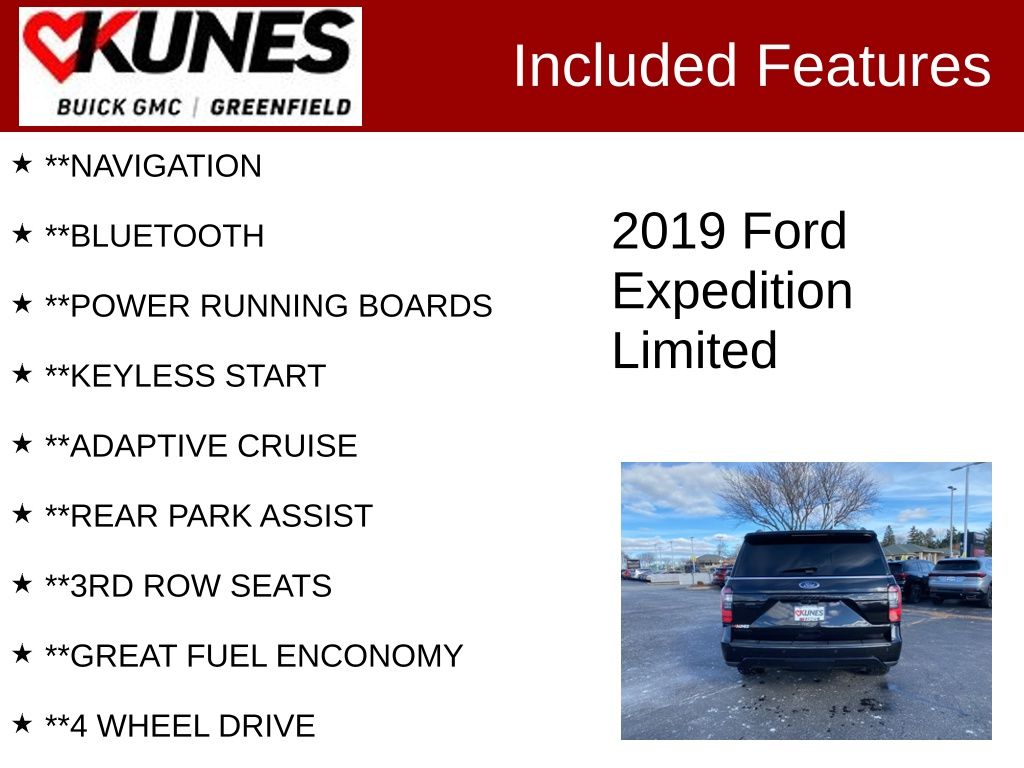 **PANORAMIC SUNROOF, **SUNROOF, **LEATHER SEATS, **APPLE CAR PLAY / ANDROID AUTO, **REMOTE START, **HEATED STEERING WHEEL, **HEATED SEATS, **HEATED / COOLED SEATS, **BACK UP CAMERA, **NAVIGATION, **BLUETOOTH, **POWER RUNNING BOARDS, **KEYLESS START, **ADAPTIVE CRUISE, **REAR PARK ASSIST, **3RD ROW SEATS, **GREAT FUEL ENCONOMY, **4 WHEEL DRIVE, **AFFORDABLE FINANCING, **NON SMOKER, **CLEAN CARFAX, **LOW MILEAGE! GREAT CONDITION!, **LOW MILEAGE, **KEYLESS ENTRY, **BLIND SPOT MONITOR, 4WD, Alloy wheels, Auto-dimming door mirrors, Automatic High Beam Headlamps, Brake assist, Bumpers: body-color, Compass, Delay-off headlights, Driver door bin, Driver vanity mirror, Electronic Stability Control, Enhanced Active Park Assist System, Exterior Parking Camera Rear, Four wheel independent suspension, Front anti-roll bar, Front Center Armrest, Front reading lights, Garage door transmitter, Gloss Black Sideview Mirror Caps, Gloss Black Tailgate Applique, Heated door mirrors, Heated rear seats, Illuminated entry, LED Fog Lamps w/Gloss Black Bezels, LED Headlamps w/Gloss Black Housing, LED Taillamp w/Gloss Black Housing, Low tire pressure warning, Occupant sensing airbag, Overhead airbag, Overhead console, Panic alarm, Passenger door bin, Passenger vanity mirror, Power Liftgate, Rain-Sensing Front Wipers, Rear anti-roll bar, Rear audio controls, Rear reading lights, Rear window wiper, Reclining 3rd row seat, Security system, Speed control, Speed-sensing steering, Speed-Sensitive Wipers, Split folding rear seat, Steering wheel memory, Steering wheel mounted audio controls, Tachometer, Telescoping steering wheel, Traction control, Trip computer, Turn signal indicator mirrors, Variably intermittent wipers, Voltmeter, Wheels: 20 Premium Dark Tarnish-Painted Aluminum.Black 2019 Ford Expedition Limited 4D Sport Utility 4WD 10-Speed Automatic EcoBoost 3.5L V6 GTDi DOHC 24V Twin TurbochargedFind out why our dealerships have won DealerRater.com DEALER OF THE YEAR a whopping 10 TIMES! Call, email, or live chat with one of our friendly sales professionals now to schedule your test drive! Prices shown do not include tax, title, registration and $599 service fees.Awards: * JD Power Automotive Performance, Execution and Layout (APEAL) Study * 2019 KBB.com 10 Best Road Trip Cars * 2019 KBB.com Best Buy Awards * 2019 KBB.com 12 Best Family Cars