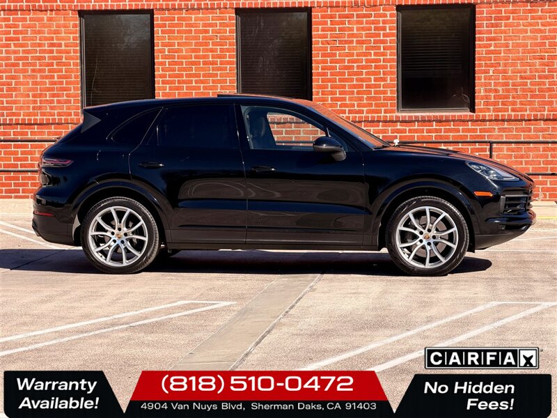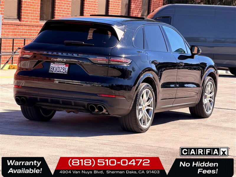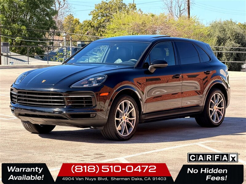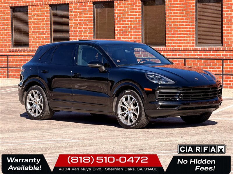 2019 Porsche Cayenne S Jet Black Metallic exterior with Black leather interior. This Cayenne S is finished in deep Jet Black Metallic and complemented by a clean, well-maintained black leather cabin. Powered by a 2.9L twin-turbo V6 delivering 440 hp and 405 lb-ft of torque, the Cayenne S pairs brisk performance with everyday usability. EPA fuel economy is 18 MPG city and 23 MPG highway. The vehicle is in excellent overall condition and carries a clean CARFAX. Performance and driving dynamics - 2.9L Twin-Turbo V6 440 hp and 405 lb-ft torque for strong acceleration and midrange pull. - 8-speed automatic transmission with manual shift capability for smooth, responsive shifts. - Porsche Traction Management (PTM) all-wheel drive and Porsche Stability Management (PSM) for confident handling in varied conditions. - Sport Chrono Package included adds the Sport button and driving mode selector, more aggressive engine and transmission mapping, and the Sport Chrono stopwatch/mode functions for sharper throttle response and enhanced dynamic control. Comfort, convenience and exterior/interior - Jet Black Metallic exterior paint for a refined, high-gloss finish. - Black leather interior with precisely stitched trim and premium materials throughout the cabin. - Power front seats with multiple adjustments and supportive bolstering designed for long drives and spirited motoring. - This example includes the optional 4-Zone Climate Control, allowing independent temperature settings for driver, front passenger and two rear-seat zones for maximum occupant comfort. Infotainment and connectivity (factory features) - Porsche Communication Management (PCM) center with a high-resolution touchscreen interface for audio, navigation and vehicle settings. - Bluetooth hands-free connectivity, USB media inputs and auxiliary support for smartphone and media integration. - Steering-wheel mounted controls and cruise control for convenient operation of infotainment and driving systems while on the move. Safety and active systems (factory features) - Comprehensive passive and active safety suite including multiple airbags, ABS, traction control and stability control (Porsche Stability Management). - Rearview camera and parking assistance systems to aid low-speed maneuvering and parking in tight spaces. - Tire pressure monitoring and advanced braking systems for predictable stopping power. Packages and options on this vehicle - Premium Package Plus enhances comfort and convenience with upgraded interior and convenience features (a factory package designed to elevate occupant comfort and onboard amenities). - Sport Chrono Package improves driving dynamics and responsiveness with selectable driving modes, performance-oriented tuning and stopwatch display. - Optional Jet Black Metallic Paint and 4-Zone Climate Control are included on this vehicle. Condition and history - Excellent overall condition inside and out, with cosmetic and mechanical care consistent with premium ownership. - Clean CARFAX report no reported accidents and a documented service history. This 2019 Porsche Cayenne S delivers a strong balance of performance, luxury and everyday practicality. If you would like additional photos, a detailed equipment list for this specific vehicle, or to schedule a test drive, we can provide prompt assistance. Anytime Auto Group 4904 Van Nuys Blvd. Sherman Oaks, CA 91403-1701 (818) 510-0472 -- INSTALLED FEATURES: Air filtration: active charcoal, Front air conditioning: automatic climate control, Front air conditioning zones: dual, Humidity/dewpoint sensors, Rear vents: second row, Airbag deactivation: occupant sensing passenger, Front airbags: dual, Knee airbags: dual front, Side airbags: front, Side curtain airbags: front / rear, Antenna type: diversity, Auxiliary audio input: Bluetooth / iPod/iPhone / jack / memory card slot / USB, In-Dash CD: DVD audio / MP3 Playback / single disc, Radio: AM/FM / HD radio / touch screen display, Radio data system, Satellite radio: SiriusXM, Speed sensitive volume control, Total speakers: 10, Watts: 150, ABS: 4-wheel, Brake drying, Braking assist, Electronic brakeforce distribution, Electronic parking brake: auto off, Emergency braking preparation, Front brake type: ventilated disc, Painted brake calipers, Power brakes, Rear brake type: ventilated disc, Armrests: rear center folding with storage and pass-thru, Cargo area floor mat: carpet, Door sill trim: aluminum, Floor mat material: carpet, Floor material: carpet, Floor mats: front / rear, Foot pedal trim: stainless steel, Interior accents: metallic-tone, Shift knob trim: alloy / leather, Steering wheel trim: alloy / leather, Ambient lighting, Assist handle: front / rear, Cargo area light, Cargo cover: retractable, Center console: front console with armrest and storage, Cruise control, Cupholders: front / rear, Multi-function remote: keyless entry / trunk release, One-touch windows: 4, Overhead console: front, Power outlet(s): 12V front / 12V rear / cargo area, Power steering: variable/speed-proportional, Power windows: lockout button, Push-button start, Reading lights: front / rear, Rearview mirror: manual day/night, Steering wheel: tilt and telescopic, Steering wheel mounted controls: audio / cruise control / multi-function / paddle shifter / phone, Storage: cargo net / cooled compartment / door pockets / front seatback, Universal remote transmitter: Homelink - garage door opener, Vanity mirrors: dual illuminating, Door handle color: body-color, Exhaust: quad tip, Exhaust tip color: alloy, Front bumper color: body-color, Grille color: black, Mirror color: body-color, Rear bumper color: body-color, Rear spoiler: roofline, Rear spoiler color: body-color, Rear trunk/liftgate: liftgate / power operated, Window trim: chrome, Infotainment screen size: 12.3 in., Clock, Compass, Digital odometer, External temperature display, Fuel economy display: MPG / range, Gauge: tachometer, Instrument cluster screen size: 7 in. (dual), Multi-function display