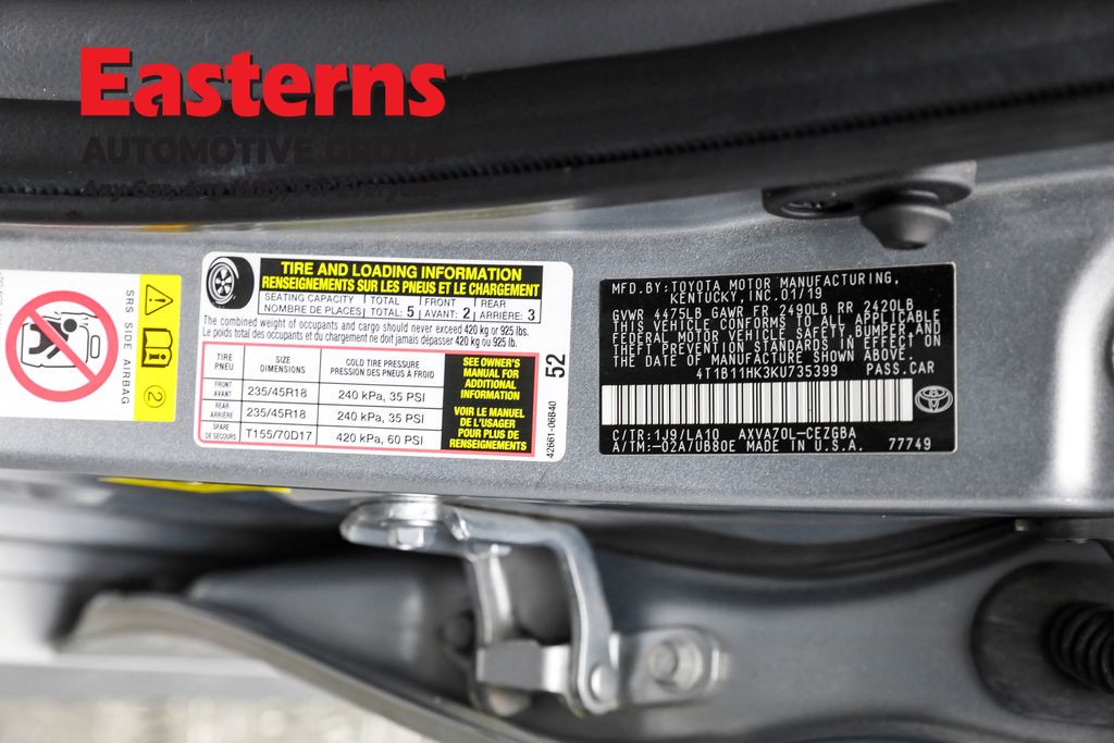 2019 Toyota Camry XLE Silver FWD 8-Speed Automatic Gray Cloth, ABS brakes, Active Cruise Control, Alloy wheels, Compass, Electronic Stability Control, Front dual zone A/C, Heated door mirrors, Heated front seats, Illuminated entry, Low tire pressure warning, Remote keyless entry, Traction control.Odometer is 37692 miles below market average! 29/41 City/Highway MPGEasterns Automotive Group has 11 locations that has sold thousands of used cars in the Maryland, DC, and Virginia communities for over the past 35 years. Every Easterns vehicle has passed a rigorous Multi-Point Quality Certification, so you can buy with confidence. Start your purchase online to save time by visiting Easterns.com... Any Car, Any Way, For Everyone.
