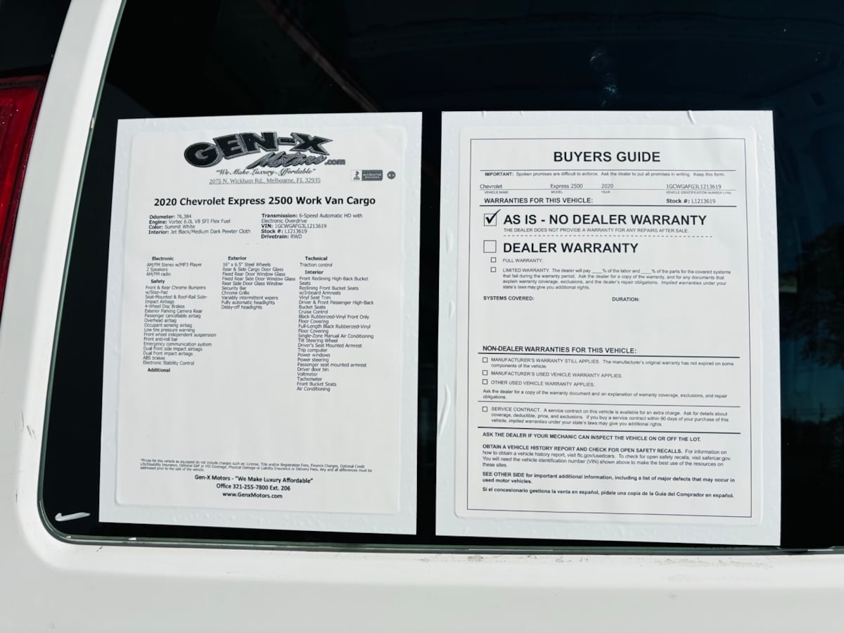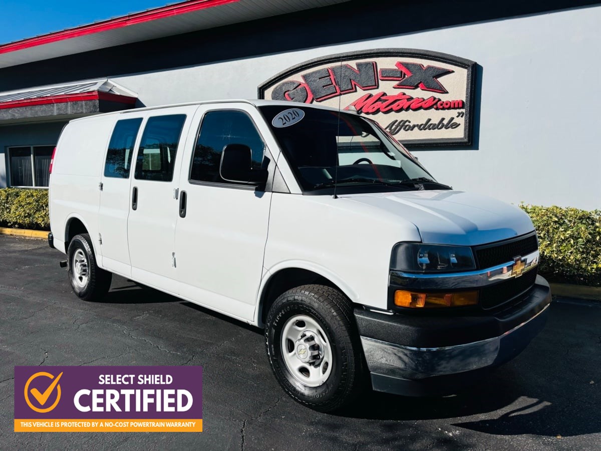 Our 2020 Chevrolet Express Cargo Van 2500 W/T is ready to get down to business in Summit White! Powered by a 6.0 Liter V8 that generates 341hp paired with a 6 Speed Automatic transmission with tow/haul mode that puts impressive capability at your command. This Rear Wheel Drive van also has a full-frame design for added strength, and it has halogen composite headlamps, a rear bumper step-pad, and swing-out passenger-side and rear cargo doors for enhanced functionality. Take a look inside our Work Van cabin to find all the basics and then some, including high-back front bucket seats, air conditioning, a front console, clever storage, dual 12V power outlets, an AM/FM/MP3 stereo, four dome lights, and WiFi compatibility for quick connectivity. The roomy rear cargo space makes upfitting a breeze, too! Chevrolet inspires on-the-job safety with a rearview camera, ABS, StabiliTrak stability/traction control, a tire-pressure monitoring system, front airbags, hill-start assist, steel side door beams, and more. Our bold Express Cargo Van 2500 W/T will help you get the most out of your investment. Save this Page and Call for Availability. We Know You Will Enjoy Your Gen-X Motors Test Drive Towards Ownership! Good credit, bad credit, or even no credit - NO problem! Whether you have good credit or bad credit, we offer financing options for everyone with rates as low as 4.99%. Rest assured with our 7-day exchange policy, designed to give you peace of mind. If your new vehicle isnt the perfect fit, simply exchange it within seven days. Weve been in business since 1994 and are A+ rated with the Better Business Bureau and a Certified CarFax Dealer. All vehicles are Gen-X Motors certified. Select vehicles include a 3-month / 3,000-mile warranty. See dealer for more details. Gen-X Motors, (321)255-7800, 2075 N Wickham Rd, Melbourne, FL 32935. Coming from out of town? Turn your trip into a two-day beach getaway while picking up your new car! We offer free delivery within 250 miles and worldwide shipping. At Gen-X Motors, we make luxury affordable - come experience the new way to buy a pre-owned car.