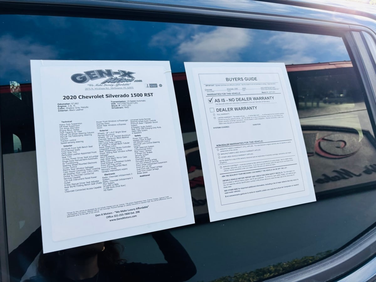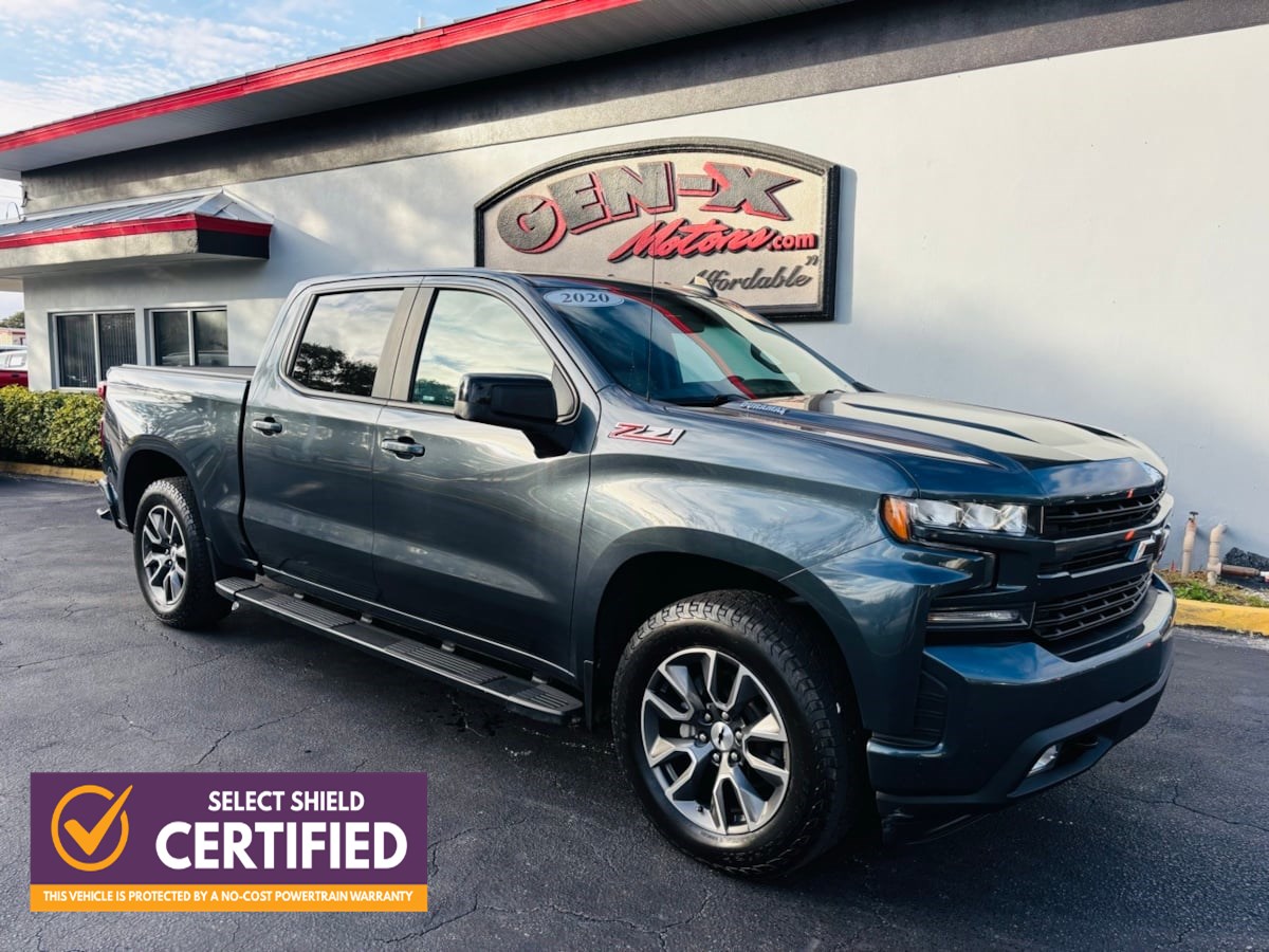 Styled for the street, our Diesel powered One Owner 2020 Chevrolet Silverado 1500 RST Crew Cab 4X4 with the Z71 Off-Road and Protection Pack has standout capability in Shadow Gray Metallic! Motivated by a TurboCharged 3.0 Liter DuraMax Diesel 6 Cylinder offering 277hp and 460lb-ft of torque matched to a 10 Speed Automatic transmission for uncompromised strength. This confident Four Wheel Drive truck also has our package's Z71 off-road suspension with Rancho twin-tube shocks, a two-speed transfer case, and a locking differential to deal with the tough stuff, plus it scores nearly 26mpg on the highway. Our Silverado's proud and practical design adds a black Bowtie badge with matching recovery hooks and mirror caps to go with LED lighting, fog lamps, alloy wheels, running boards, an EZ Lift/Lower tailgate, a spray-on Bedliner, tonneau cover, and a rear CornerStep bumper. An expressive appearance highlights the RST cabin with heated leather front seats, 10-way power for the driver, a leather heated steering wheel, dual-zone automatic climate control, and remote start. As for smart technology, you'll appreciate the 8-inch touchscreen, WiFi compatibility, Apple CarPlay, Android Auto, Bluetooth, and a six-speaker sound system whether you want to connect or kick out the jams! Ride in confidence knowing Chevrolet provides helpful features, including hitch guidance, a rearview camera, tire-pressure monitoring, StabiliTrak stability/traction control, ABS, and dual-stage airbags. With all that and more, our Silverado 1500 RST goes for the gold every day! Save this Page and Call for Availability. We Know You Will Enjoy Your Gen-X Motors Test Drive Towards Ownership! Good credit, bad credit, or even no credit - NO problem! Whether you have good credit or bad credit, we offer financing options for everyone with rates as low as 4.99%. Rest assured with our 7-day exchange policy, designed to give you peace of mind. If your new vehicle isnt the perfect fit, simply exchange it within seven days. Weve been in business since 1994 and are A+ rated with the Better Business Bureau and a Certified CarFax Dealer. All vehicles are Gen-X Motors certified. Select vehicles include a 3-month / 3,000-mile warranty. See dealer for more details. Gen-X Motors, (321)255-7800, 2075 N Wickham Rd, Melbourne, FL 32935. Coming from out of town? Turn your trip into a two-day beach getaway while picking up your new car! We offer free delivery within 250 miles and worldwide shipping. At Gen-X Motors, we make luxury affordable - come experience the new way to buy a pre-owned car.