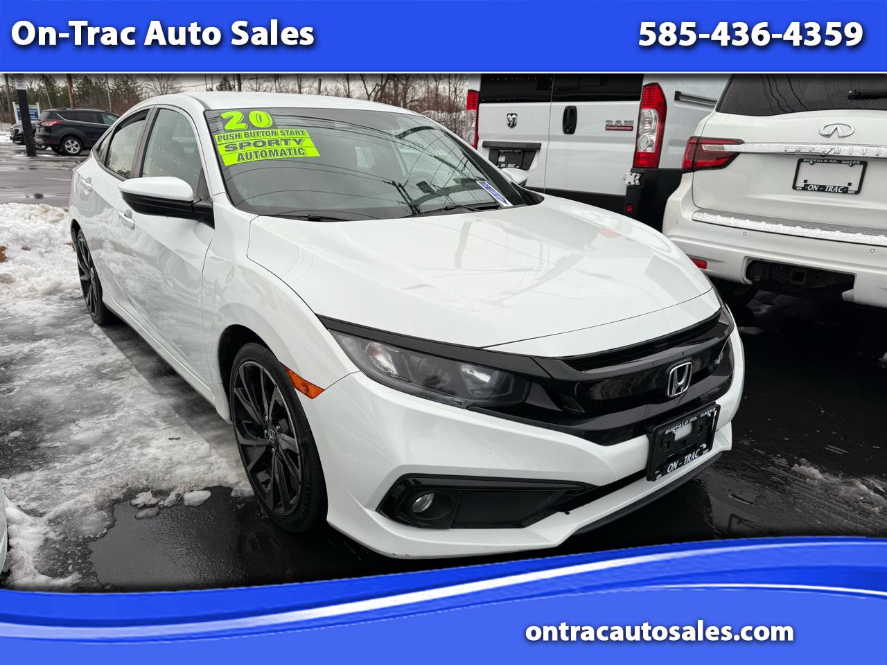 Get ready to rev up your daily commute in this sleek and stylish 2020 Honda Civic Sedan! With a peppy 2.0L I-4 engine under the hood and a continuously variable transmission, this front-wheel-drive beauty is ready to hit the road with confidence. The aerodynamic design is accentuated by body-colored bumpers, a chrome-accented grille, and striking halogen headlights that automatically switch to high beams. Step inside the comfortable cabin and sink into the supportive front bucket seats while cruising to your favorite tunes on the 8-speaker sound system. Stay connected with the 2 LCD monitors and take advantage of the adaptive cruise control for a stress-free drive. Plus, with features like the automatic climate control, remote keyless entry, and a rearview camera, every journey is a breeze. Safety is a top priority with dual-stage front airbags, side curtain airbags, and a collision mitigation braking system. Rest easy knowing that this Civic is equipped with advanced safety features to keep you and your passengers protected. Don't miss out on the opportunity to own this fantastic 2020 Honda Civic Sedan - it's the perfect blend of performance, style, and reliability! Visit On-Trac Auto Sales online at ontracautosales.com to see more pictures of this vehicle or call us at 585-436-4359 today to schedule your test drive.