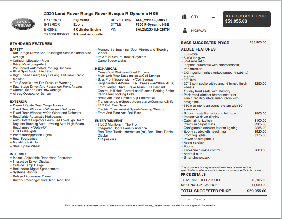 VEHICLE LOCATED IN FISHERS, IN: 9200 E 131ST ST FISHERS, INDIANA 46038 Experience the epitome of luxury and performance with this stunning 2020 Land Rover Range Rover Evoque R-Dynamic HSE. Boasting a sleek white exterior and a sophisticated interior, this SUV is the perfect blend of style and substance.- *LOCAL HOME DELIVERY AVAILABLE!*- Navigation system: InControl Navigation Pro- 11 Speakers- 380 Watt Meridian Sound System w/10-Speakers- Air Conditioning- Automatic temperature control- Power driver seat- Power steering- Power windows- Remote keyless entry- 4-Wheel Disc Brakes- ABS brakes- Dual front impact airbags- Dual front side impact airbags- Emergency communication system: InControl Protect- Power Liftgate- Exterior Parking Camera Rear- Auto High-beam Headlights- 16-Way Front Seats w/Memory- Android Auto- Apple CarPlay- Auto-dimming Rear-View mirror- Leather Shift Knob- 20 WheelsThis Land Rover Range Rover Evoque R-Dynamic HSE is powered by a robust I4 engine mated to a 9-Speed Automatic transmission, delivering a smooth and efficient driving experience. With an impressive 21 MPG in the city and 26 MPG on the highway, you'll enjoy exceptional fuel economy without sacrificing performance.The interior of this Evoque is a true sanctuary, with premium features that cater to your every need. The 16-way power-adjustable front seats with memory settings ensure unparalleled comfort, while the Meridian sound system provides an immersive audio experience. The intuitive InControl Navigation Pro system and Apple CarPlay/Android Auto integration keep you connected and in control.Safety is of the utmost importance, and this Evoque is equipped with a comprehensive suite of advanced safety features. From dual front and side impact airbags to the emergency communication system and rear parking camera, you can drive with confidence knowing you and your passengers are well-protected.This 2020 Land Rover Range Rover Evoque R-Dynamic HSE is a true standout in the luxury SUV segment. With its exceptional performance, premium amenities, and uncompromising safety, it's the perfect choice for the discerning driver who demands the best. Experience the difference for yourself and schedule a test drive today.