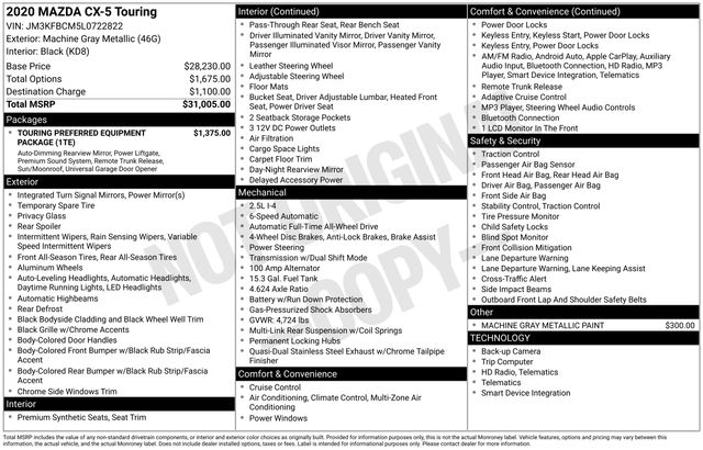 At Westgate Dodge Ram Kia of Wake Forest we provide what every customer wants our Best Price upfront. No need to negotiate as we use live market data for pricing to provide a current competitive price based on year, make, model, miles, options, and condition of the vehicle. Online pricing does not include our documentation fee of $799, taxes, government fees, and anti theft recovery device installed with 1 year of service included for $799. 5 years of service for $1,499 available. Bose 10-Speaker Audio Sound System Power Sliding-Glass Moonroof w/Interior Sunshade Power Rear Liftgate Machine Gray Metallic Paint Auto Dimming Rearview Mirror w/HomeLink Leatherette Seat TrimThis stunning 2020 Mazda CX-5 Touring is an exceptional choice for the discerning driver. Powered by a robust SKYACTIV 2.5L 4-cylinder engine paired with a smooth-shifting 6-speed automatic transmission, this all-wheel-drive SUV delivers an impressive blend of performance and efficiency, with an EPA-estimated 24 mpg in the city and 30 mpg on the highway.Beyond its dynamic capabilities, the CX-5 Touring boasts a wealth of premium features that elevate the driving experience. The Bose 10-speaker audio system, with Centerpoint2 and AudioPilot2 technology, provides an immersive, concert-quality sound, while the power sliding-glass moonroof allows you to enjoy the great outdoors. The programmable power rear liftgate adds convenience, and the machine gray metallic paint gives the exterior a sleek, sophisticated appearance.For added peace of mind, this CX-5 Touring is equipped with a host of advanced safety technologies, including a Lane Departure Warning System and an Exterior Parking Camera Rear. The auto-dimming rearview mirror with HomeLink further enhances the vehicle's convenience and functionality.Inside, the CX-5 Touring pampers you with comfortable leatherette seating, a power-adjustable driver's seat, and dual-zone automatic climate control. Steering wheel-mounted audio controls and Apple CarPlay and Android Auto integration make it easy to stay connected on the go.With its exceptional blend of style, performance, and features, this 2020 Mazda CX-5 Touring is an exceptional value that is sure to impress. Visit us at Westgate Kia and Westgate Dodge Ram in Wake Forest, NC, to experience it for yourself and discover why it should be your next vehicle.Shop with confidence at Westgate Kia and Westgate Dodge Ram in Wake Forest, NC, your go-to destination for new Kia and Ram vehicles as well as a wide selection of quality pre-owned cars, trucks, and SUVs. Serving Wake Forest, Raleigh, the greater Triangle, and surrounding communities, Westgate delivers trusted service, competitive pricing, and a hassle-free buying experience for every driver in North Carolina.