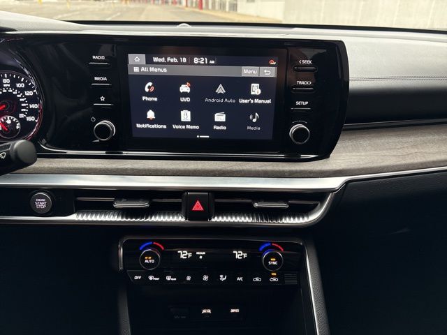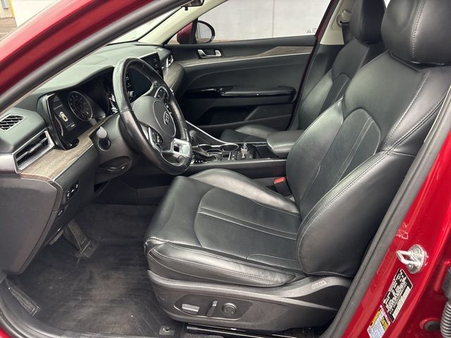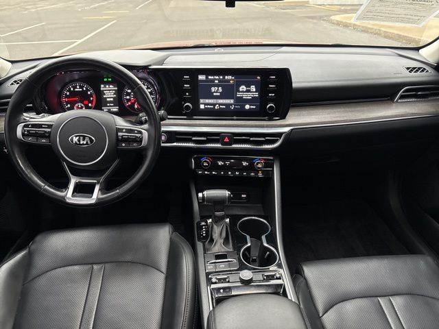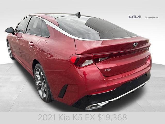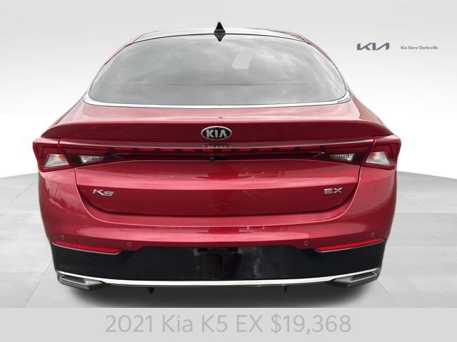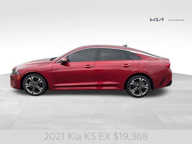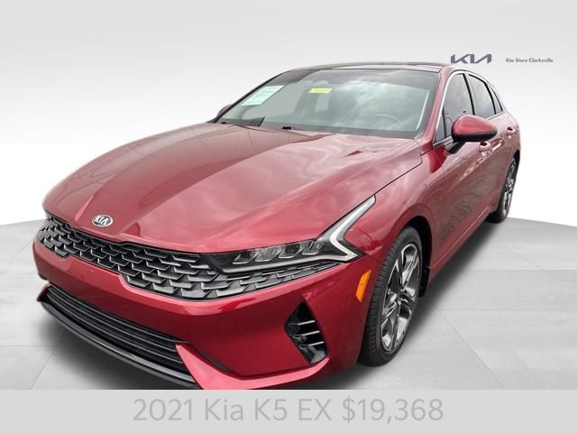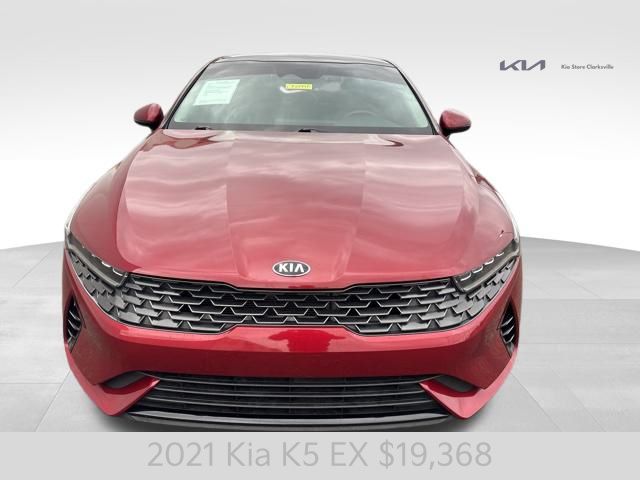 Introducing the 2021 Kia K5 EX - a captivating mid-size sedan that combines style, performance, and cutting-edge technology. This striking Passion Red vehicle is a true head-turner, with its sleek lines and bold presence commanding attention wherever it goes. Passion Red Exterior Cargo NetUnder the hood, the K5 EX boasts a 1.6L I4 DGI engine, paired with an 8-Speed Automatic transmission and Front-Wheel Drive, delivering an impressive balance of power and efficiency. With 27 MPG in the city and 37 MPG on the highway, this sedan will keep you moving with confidence and ease.The K5 EX is packed with a host of premium features that elevate your driving experience. Enjoy the convenience of Smart Key with Push Button Start and Remote Start, as well as the comfort of Heated and Ventilated Front Bucket Seats. Stay connected with the state-of-the-art AM/FM/MP3/SiriusXM Audio System, seamlessly integrated with Apple CarPlay and Android Auto.Safety is a top priority in the K5 EX, with a comprehensive suite of advanced driver assistance technologies. From Dual Front Impact Airbags and Dual Front Side Impact Airbags to Electronic Stability Control and Rear Side Impact Airbag, this sedan is designed to keep you and your loved ones secure on the road.Elevate your driving experience with the available Power Moonroof, allowing you to bask in the natural light and fresh air. The 7.5J x 18 Gray Machined Finish Alloy Wheels add a touch of sophistication to the exterior, complementing the bold and dynamic styling.As you step inside the K5 EX, you'll be greeted by a spacious and well-appointed cabin, featuring Leatherette Seat Trim and a Rear Seat Center Armrest for added comfort and convenience. The Split Folding Rear Seat provides versatility, allowing you to accommodate your ever-changing cargo needs.This 2021 Kia K5 EX is a remarkable sedan that seamlessly blends style, performance, and technology. Experience the difference for yourself and schedule a test drive today. We're confident you'll be impressed by the exceptional value and driving experience this vehicle has to offer.
