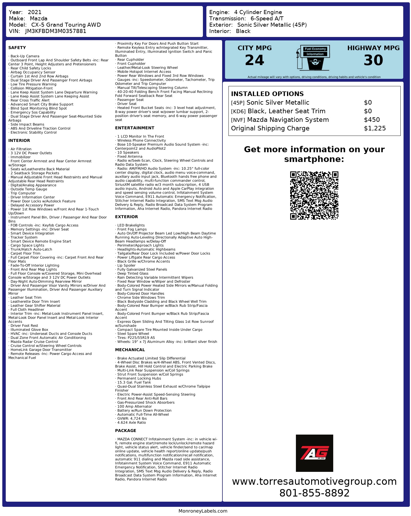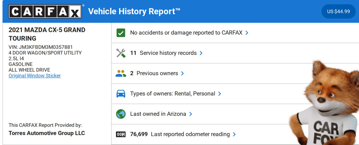 We provide upfront, no-pressure pricing for your peace of mind. We are a Credit Union Direct Authorized Dealership and are able to finance your new car through YOUR credit union and even shop for the lowest rate possible, all, here at our dealership. CLEAN TITLE. No accidents or damage reported to CARFAX, 11 Service records available. This vehicle has passed a 200 point mechanical inspection. View the full inspection on our website for free! Call to set up an appointment today Office: (801) 855-8892 Text: (801) 893-7784 For a speedy approval, enjoy our online car buying experience, fill out a secure online application now on our website, just select financing! Introducing the 2021 Mazda CX-5 Grand Touring AWD, a strikingly styled SUV that perfectly balances performance, luxury, and technology. Cloaked in Sonic Silver Metallic, this elegant vehicle commands attention with its sleek lines and bold presence on the road. The aerodynamic curves and distinctly designed front grille hint at the performance housed under the hood, while the LED headlights provide excellent visibility and a memorable visual signature. Step inside the Mazda CX-5, where black leather seat trim envelops you in comfort and sophistication. The spacious interior, meticulously designed for both driver and passenger enjoyment, features high-quality materials and an intuitive layout. Equipped with the Mazda navigation system, your journeys are made seamless, allowing you to explore with confidence and ease. The cabin offers a perfect blend of modern technology and luxurious touches, creating an inviting atmosphere for every adventure. Under the hood lies a robust 2.5L 4-cylinder engine, delivering both efficiency and spirited performance regardless of driving conditions. Coupled with an All-Wheel Drive drivetrain, this SUV ensures superior traction and control whether you're navigating city streets or venturing onto rugged paths. The Grand Touring AWD style raises the bar for comfort and capability, embodying a refined driving experience. With its array of advanced features and dynamic design, the 2021 Mazda CX-5 Grand Touring AWD remains a standout choice for those seeking a sophisticated and engaging ride. We reserve the right to end this listing at any time should the vehicle no longer be available for sale. Prices are subject to change without notice. Please contact the dealer to verify all details. We do not accept holds or deposits. The only way to secure this vehicle at the listed price is through immediate purchase. Torres Automotive Group 363 W 800 N OREM UT 84057 561A DISCLAIMER:THE DEALERSHIP IS NOT RESPONSIBLE FOR TYPOGRAPHICAL ERRORS, MISPRINTS ON PRICES OR EQUIPMENT.