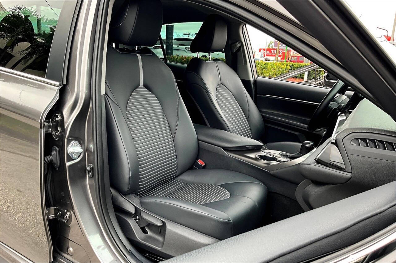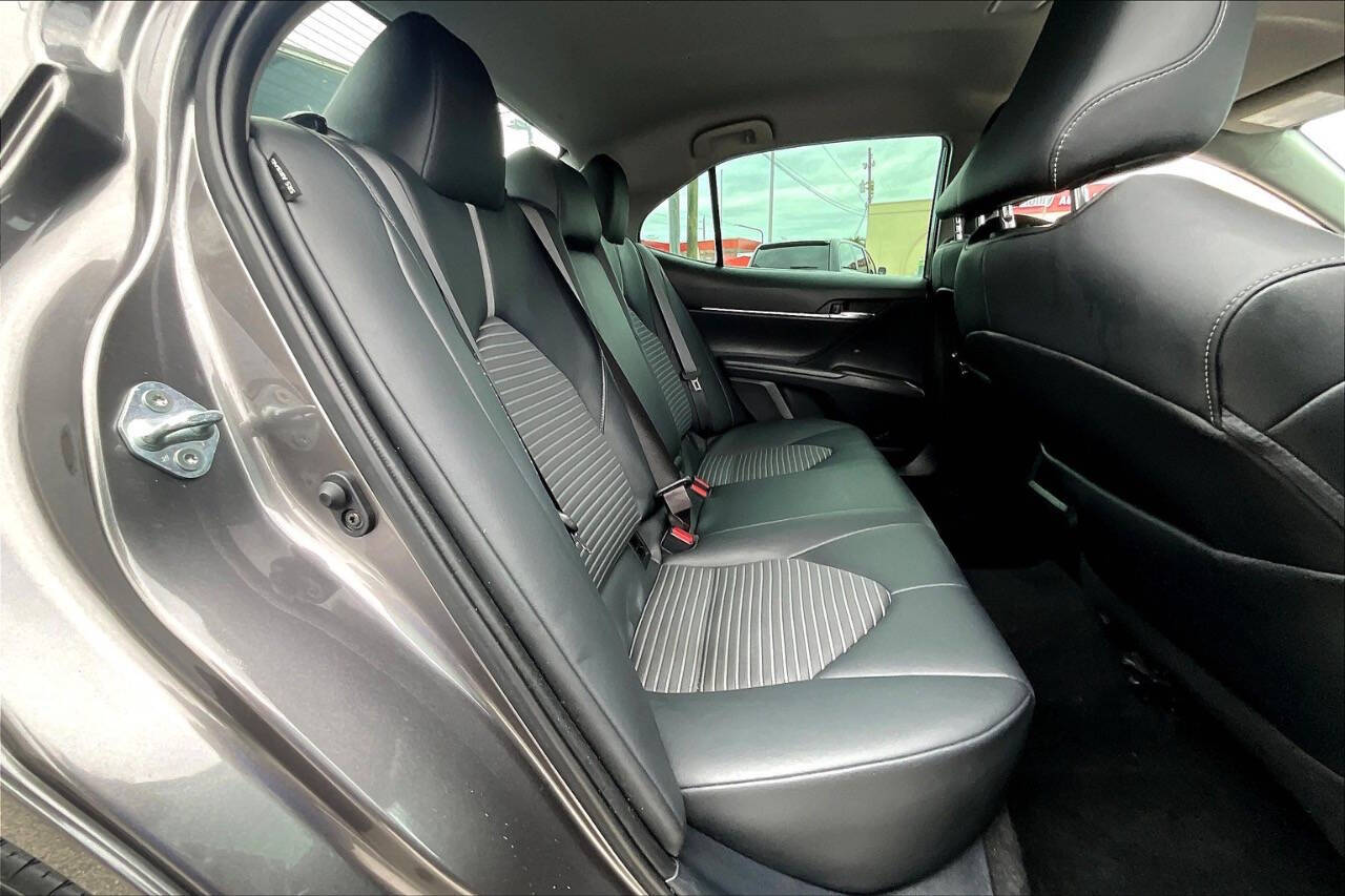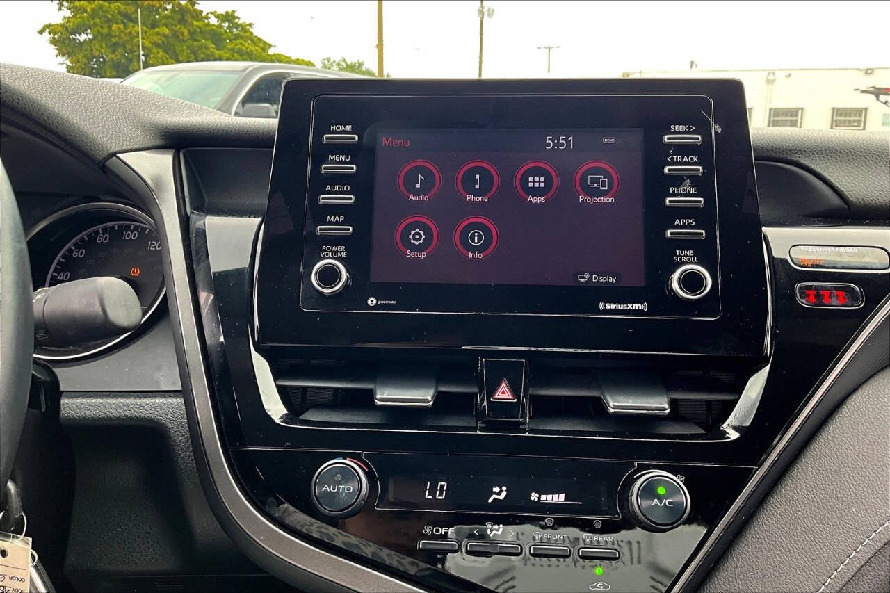 2021 Toyota Camry SE Sporty, Reliable, and Efficient The SE trim (Sport Edition) of the 2021 Camry adds an athletic touch to one of the most reliable sedans on the market. It's a midsize sedan that balances performance, style, and practicality, perfect for daily commutes or longer road trips. Performance & Efficiency Engine: 2.5L 4-cylinder DOHC 16-valve with Dual VVT-i Horsepower: 203 hp @ 6,600 rpm Torque: 184 lb-ft @ 5,000 rpm Transmission: 8-speed automatic with paddle shifters (SE-specific) Drivetrain: Front-Wheel Drive (AWD optional in some versions) Fuel Economy (EPA est.): FWD: 28 MPG city / 39 MPG highway AWD: 25 MPG city / 34 MPG highway Interior & Comfort Features Seating: Sport SofTex-trimmed front seats (power-adjustable drivers seat) Infotainment: 7-inch touchscreen (upgradeable to 9-inch) Apple CarPlay, Android Auto, and Amazon Alexa 6-speaker audio system Climate Control: Single-zone automatic Rear Seats: 60/40 split fold-down for extended cargo space Safety & Driver Assistance Standard Toyota Safety Sense 2.5 includes: Pre-Collision System with Pedestrian Detection Lane Departure Alert with Steering Assist Full-Speed Dynamic Radar Cruise Control Automatic High Beams Lane Tracing Assist Road Sign Assist Rearview camera Optional Blind Spot Monitor with Rear Cross-Traffic Alert Exterior Highlights Wheels: 18-inch black machined-finish alloy wheels Grille: Sport mesh front grille with gloss-black trim Lighting: LED headlights with LED DRLs and taillights Body Kit: Sport-style side rocker panels and rear spoiler Exhaust: Single exhaust with dual chrome tips Cargo & Utility Trunk Space: 15.1 cubic feet Fuel Tank Capacity: 15.8 gallons Towing Capacity: Not rated for towing Why Choose the 2021 Camry SE? A sportier drive and appearance than the base LE, without going into full XSE price range. Comes standard with advanced safety tech, great gas mileage, and Toyotas legendary reliability. Practical for families or solo commuters seeking a sharp-looking car with performance and comfort.