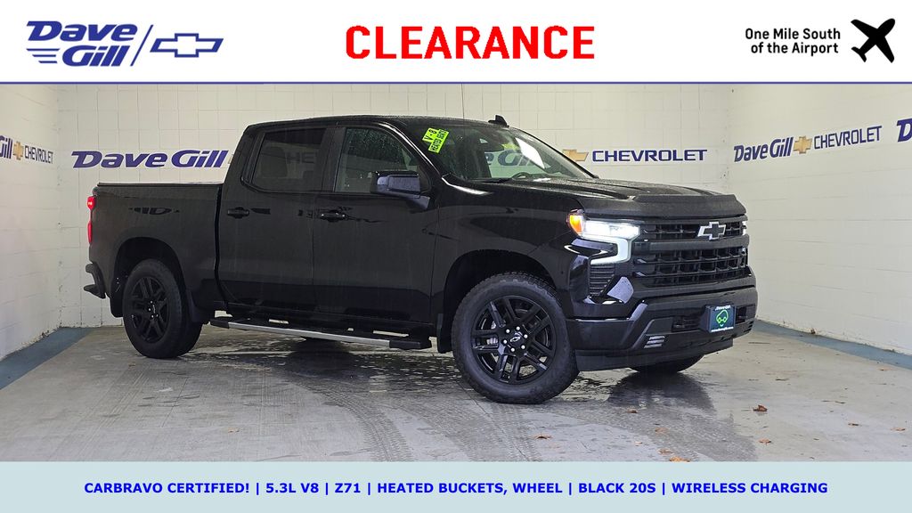WHAT IS CARBRAVO? ALL CARBRAVO CERTIFIED USED VEHICLES INCLUDE A 12-MONTH, 12,000-MILE FACTORY BACKED NEAR BUMPER-TO-BUMPER WARRANTY THAT IS VALID NATIONWIDE! * GOOD NEWS: THIS VEHICLE MEETS THAT CARBRAVO STANDARD! * CARBRAVO CERTIFIED! * 5.3L V8 * Z71 * HEATED BUCKET SEATS, WHEEL * BLACK 20S * WIRELESS CHARGING * 2022 Chevrolet Silverado 1500 RST EcoTec3 5.3L V8 Black CarBravo Certified Used, Z71, Crew Cab, ONE OWNER!, 10-Speed Automatic, 4WD, Jet Black w/Cloth Seat Trim, 10-Way Power Driver Seat w/Lumbar, 12.3 Multicolor Reconfigurable Digital Display, 120-Volt Bed Mounted Power Outlet, 120-Volt Instrument Panel Power Outlet, 2 USB Data Ports, 6-Speaker Audio System, 6 Rectangular Chrome Tubular Assist Steps (LPO), All-Star Edition, AM/FM radio: SiriusXM with 360L, Apple CarPlay/Android Auto, Auto-Locking Rear Differential, Automatic Emergency Braking, Automatic temperature control, Bluetooth For Phone, Color-Keyed Carpeting Floor Covering, Compass, Convenience Package, Deep-Tinted Glass, Dual Exhaust w/Polished Outlets, Dual Rear USB Ports (Charge Only), Dual-Zone Automatic Climate Control, Electric Rear-Window Defogger, Electrical Steering Column Lock, Electronic Cruise Control, Electronic Transmission Range Selector Shifter, EZ Lift Power Lock & Release Tailgate, Floor Mounted Center Console, Following Distance Indicator, Forward Collision Alert, Front Bucket Seats, Front dual zone A/C, Front Frame-Mounted Black Recovery Hooks, Front LED Fog Lamps, Front Pedestrian Braking, Front Rubberized Vinyl Floor Mats, HD Rear Vision Camera, Heated Driver & Front Outboard Passenger Seats, Heated Power-Adjustable Outside Mirrors, Heated Steering Wheel, Heavy-Duty Air Filter, High Capacity Suspension Package, High Gloss Black Mirror Caps, Hill Descent Control, Inside Rear-View Mirror w/Tilt, IntelliBeam Automatic High Beam On/Off, Keyless Open & Start, Lane Keep Assist w/Lane Departure Warning, Leather Wrapped Steering Wheel, LED Cargo Area Lighting, Manual Tilt/Telescoping Steering Column, Off-Road Suspension, OnStar & Chevrolet Connected Services Capable, Power Front Windows w/Driver Express Up/Down, Power Front Windows w/Passenger Express Down, Power Rear Windows w/Express Down, Preferred Equipment Group 1SP, Radio: Chevrolet Infotainment 3 Premium System, Rear 60/40 Folding Bench Seat (Folds Up), Rear Rubberized-Vinyl Floor Mats, Remote Vehicle Starter System, SiriusXM w/360L, Standard Tailgate, Steering Wheel Audio Controls, Theft Deterrent System (Unauthorized Entry), Trailering Package, Wheels: 20 x 9 High Gloss Black Painted Alum, Wireless Charging, Wireless Phone Projection, Z71 Off-Road Package.Your peace of mind is important to us. We have included over 24 photos so that you can judge the condition of this vehicle yourself. As you do your comparison shopping, you will see Dave Gill Chevrolet offers some of the best values in the market for your hard-earned money. Our commitment to customer satisfaction is our number one priority, and we do not use high-pressure sales tactics. We inspect and service all our used cars as necessary; not simply take it to the local car wash and use their free vacuums. We will provide you a Carfax, vehicle inspection results, and how we arrived at the price. We may not always be the lowest, but if you want to know who is, we will show you that, too. Call or stop by Dave Gill Chevrolet at 4700 E. Broad Street in Columbus to schedule a test drive today. Serving the Greater Columbus Area. We are just minutes from Port Columbus Airport and offer free pick-up for our out-of-town guests.Odometer is 7321 miles below market average!