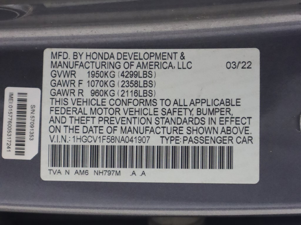 2022 Honda Accord EX-L Modern Steel Metallic 4D Sedan 1.5T I4 DOHC 16V Turbocharged VTEC17 Machine-Finished Alloy Wheels, Adaptive Cruise Control: Adaptive Cruise Control (ACC) with Low-Speed Follow, Apple CarPlay/Android Auto, Auto High-beam Headlights, Automatic temperature control, Blind Spot Information (BSI) System warning, Delay-off headlights, Exterior Parking Camera Rear, Forward collision: Collision Mitigation Braking System (CMBS) + FCW mitigation, Front dual zone A/C, Front fog lights, Fully automatic headlights, Heated front seats, Lane Departure Warning System, Memory seat, Power driver seat, Power moonroof, Power passenger seat, 10 Speakers, 4-Wheel Disc Brakes, ABS brakes, Air Conditioning, Alloy wheels, AM/FM radio: SiriusXM, Auto-dimming Rear-View mirror, Brake assist, Bumpers: body-color, Driver door bin, Driver vanity mirror, Dual front impact airbags, Dual front side impact airbags, Electronic Stability Control, Emergency communication system: HondaLink, Four wheel independent suspension, Front anti-roll bar, Front Bucket Seats, Front Center Armrest, Front reading lights, Garage door transmitter: HomeLink, Heated door mirrors, Heated Front Bucket Seats, Illuminated entry, Knee airbag, Leather Shift Knob, Leather steering wheel, Low tire pressure warning, Occupant sensing airbag, Outside temperature display, Overhead airbag, Overhead console, Panic alarm, Passenger door bin, Passenger vanity mirror, Perforated Leather Seat Trim, Power door mirrors, Power steering, Power windows, Radio data system, Radio: 450-Watt AM/FM/HD Premium Audio System, Rear anti-roll bar, Rear seat center armrest, Rear window defroster, Remote keyless entry, Security system, Speed control, Speed-sensing steering, Speed-Sensitive Wipers, Split folding rear seat, Steering wheel mounted audio controls, Tachometer, Telescoping steering wheel, Tilt steering wheel, Traction control, Trip computer, Turn signal indicator mirrors, Variably intermittent wipers, Front & rear parking sensors, Keyless start, Lane keep assist, 17 Machine-Finished Alloy Wheels, Adaptive Cruise Control: Adaptive Cruise Control (ACC) with Low-Speed Follow, Apple CarPlay/Android Auto, Auto High-beam Headlights, Automatic temperature control, Blind Spot Information (BSI) System warning, Delay-off headlights, Exterior Parking Camera Rear, Forward collision: Collision Mitigation Braking System (CMBS) + FCW mitigation, Front dual zone A/C, Front fog lights, Fully automatic headlights, Heated front seats, Lane Departure Warning System, Memory seat, Power driver seat, Power moonroof, Power passenger seat.Clean CARFAX. CARFAX One-Owner. Priced below KBB Fair Purchase Price! 30/38 City/Highway MPGSTOP OVERPAYING!!! SAVE THOUSANDS ON BOTH - YOUR CAR PURCHASE AND A FINANCING TOGETHER!!! YOU CAN'T MISS THIS DEAL!!! JUST TAKE A LOOK!!! KBB prices reflects a value of the vehicle for the vehicle published by Kelly Blue Book within the last 60 days.Financing is available for all credit situations. The financing team at Honda of Cleveland Heights has decades of experience and wide-ranging lending relationships to get you financed on the vehicle of your dreams! Visit us online at www.hondaofclevelandheights.com. Here, at Honda of Cleveland Heights, we are proud to offer low mile, late model inventory at incredible prices. All of our vehicles are inspected and reconditioned by ASE certified technicians. Honda of Cleveland Heights sets out to offer all clients great prices, flexible financing terms, high-quality vehicles, and a thoroughly transparent buying process. Please call us today to begin your purchase!