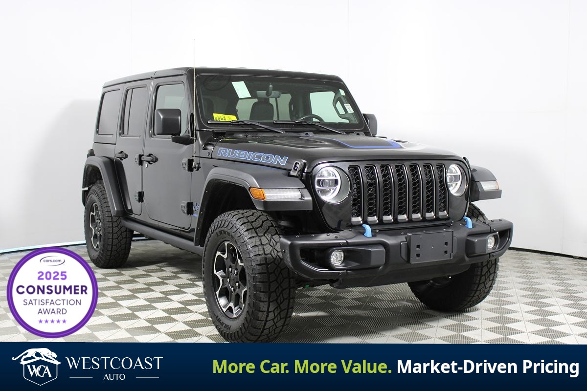 The 2022 Jeep Wrangler 4xe Unlimited Rubicon 4x4 in sleek Black Clearcoat represents rugged elegance intertwined with cutting-edge technology. This vehicle is powered by a robust 2.0L 4-cylinder engine and features a Four Wheel Drive drivetrain, making it the ultimate off-road companion. Its bold design is complemented by the distinctive body color 3-piece hard top, providing both aesthetic appeal and functional versatility.The interior of the Wrangler 4xe is nothing short of luxurious, featuring black leather trimmed bucket seats that exude sophistication. Designed for convenience and comfort, this model includes heated seats and a cold weather group, ensuring optimal warmth during chilly adventures. Modern technology is at your fingertips with features like Bluetooth connectivity, a premium sound system, and a navigation system, keeping you connected and entertained no matter the journey.Safety is a top priority in this Off-road machine, highlighted by advanced features such as a blind spot monitor, parking assist, and a comprehensive safety group. The vehicle also boasts LED headlights and auto high beams, enhancing visibility in all driving conditions. Additional convenience is provided by the towing package and remote start functionality, ensuring the Wrangler adapts to both urban environments and rugged landscapes with ease. 72 HOUR FLASH EVENT WESTCOAST AUTO CPO-Quality Vehicles. Market-Driven Pricing. Serious Approvals. For 72 hours, were spotlighting some of the cleanest inventory in Southern California. At West Coast Auto, we specialize in exceptionally well-kept, fully inspected vehicles selected for condition, options, and overall quality. Market-Positioned Pricing Aggressive Financing Approvals Credit Challenge Welcome Trade-In Assistance Fast, Professional Buying Experience This event is built for buyers who care about quality, strong approvals, and a smooth transaction.