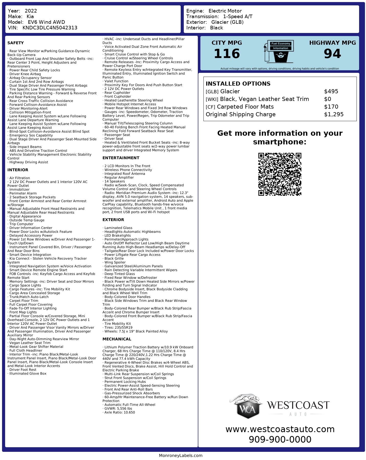 Impressively efficient, our 2022 Kia EV6 Wind AWD is here to blow you away in Glacier! Powered by Dual Electric Motors that deliver a combined 320hp to a Single Speed Automatic transmission for dynamic performance at the press of a pedal. This All Wheel Drive SUV can also serve as a portable generator, plus it goes the distance with a 77.4kWh battery pack that allows nearly 282 miles of EV travel. Boldly crafted to command attention, our EV6 boasts LED lighting, a hands-free liftgate, flush door handles, heated power-folding mirrors, gloss-black details, and black alloy wheels. Our Wind cabin offers a world of luxury with heated/ventilated vegan-leather power front seats, a vegan-leather two-spoke heated steering wheel, dual-zone automatic climate control, pushbutton ignition, remote start, keyless access, and dual 12.3-inch displays for a dramatic digital dashboard. Additional infotainment advantages include voice recognition, connected navigation, Android Auto, Apple CarPlay, WiFi compatibility, Bluetooth, wireless charging, and a 14-speaker Meridian audio system. Kia's intelligent Drive Wise technologies support your safety with Highway Driving Assist, remote parking assistance, surround vision, front/rear automatic braking, lane-keeping assistance, adaptive cruise control, and much more. Recharge your spirit with our remarkable EV6 Wind today! Save this Page and Call for Availability. We Know You Will Enjoy Your Test Drive Towards Ownership! Great quality, easy financing and affordable prices aren't the only things that make Westcoast Auto Sales the first choice of many discerning auto buyers. Stop in and See California's Dealer of the Year! The Cheapest Isnt the Best Value Low prices often come with added fees or compromises The price you see is the real price No forced add-ons No last-minute changes More Car. More Value. Zero Games.