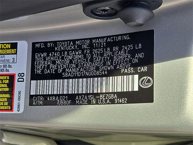 This 2022 Lexus ES has passed the Lynnes comprehensive 172 point inspection with flying colors. Our ASE certified technicians have inspected this ES and have brought it up to date with all its regularly scheduled maintenance. Buy this ES and have confidence that it will bring you years of reliable Transportation.Clean CARFAX. Priced below KBB Fair Purchase Price! 2022 Lexus ES 250 Moonbeam 8-Speed Automatic AWD I425/34 City/Highway MPG Drive Home Happy Promise, New Beginning Automotive Financing - Our Goal 100% Credit Approval, Black W/Black Open Pore Leather, 10 Speakers, 10-Way Power Adjustable Front Seats, 4-Wheel Disc Brakes, ABS brakes, Acoustic Side Glass, Air Conditioning, All-Weather Floor Liners w/Trunk Tray (PPO), Alloy wheels, AM/FM radio: SiriusXM, Apple CarPlay/Android Auto, Auto High-beam Headlights, Auto tilt-away steering wheel, Auto-dimming door mirrors, Auto-dimming Rear-View mirror, Automatic temperature control, Brake assist, Bumpers: body-color, CD player, Compass, Delay-off headlights, Door Edge Guards (PPO), Driver door bin, Driver vanity mirror, Dual front impact airbags, Dual front side impact airbags, Electrochromic Rear-View Mirror, Electronic Stability Control, Emergency communication system, Exterior Parking Camera Rear, Four wheel independent suspension, Front & Rear Performance Rods, Front anti-roll bar, Front Bucket Seats, Front Center Armrest, Front dual zone A/C, Front reading lights, Fully automatic headlights, Garage door transmitter: HomeLink, Genuine wood console insert, Genuine wood dashboard insert, Genuine wood door panel insert, Heated & Ventilated Seats, Heated door mirrors, Heated front seats, Heated Leather & Wood 3-Spoke Steering Wheel, Heated steering wheel, Illuminated entry, Key Card, Knee airbag, Leather Shift Knob, Leather steering wheel, Low tire pressure warning, Memory seat, Navigation, Occupant sensing airbag, Outside temperature display, Overhead airbag, Overhead console, Panic alarm, Parking Support Alert/Brake, Passenger door bin, Passenger vanity mirror, Perforated Leather Seat Trim, Power door mirrors, Power driver seat, Power moonroof, Power passenger seat, Power Rear Sunshade, Power steering, Power Tilt/Telescoping Steering Wheel w/Memory, Power windows, Radio data system, Radio: Lexus Multimedia System, Rain Sensing Wipers, Rain sensing wipers, Rear anti-roll bar, Rear reading lights, Rear seat center armrest, Rear side impact airbag, Rear Spoiler, Rear Window Blind, Rear window defroster, Remote keyless entry, Security system, Speed control, Speed-sensing steering, Steering wheel memory, Steering wheel mounted audio controls, Tachometer, Telescoping steering wheel, Tilt steering wheel, Traction control, Trip computer, Turn signal indicator mirrors, Variably intermittent wipers, Ventilated front seats, Wheels: 18 x 8J Split-10-Spoke Alloy, Windshield De-Icer, Wireless Charger, Wood Trim w/Ambient Lighting, Black W/Black Open Pore Leather.Type your sentence here.