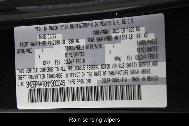 At Westgate Dodge Ram Kia of Wake Forest we provide what every customer wants our Best Price upfront. No need to negotiate as we use live market data for pricing to provide a current competitive price based on year, make, model, miles, options, and condition of the vehicle.Online pricing does not include our documentation fee of $799, taxes, government fees, and anti theft recovery device installed with 1 year of service included for $799. 5 years of service for $1,499 available. ONE OWNER CLEAN CARFAX CARGO NETThis 2022 Mazda Mazda3 2.0 is a standout choice for the discerning driver. With its sleek black exterior and well-appointed interior, this vehicle exudes style and sophistication. Boasting an efficient 2.0L I4 engine paired with a smooth-shifting 6-speed automatic transmission, this Mazda3 delivers an impressive 28 city/36 highway MPG, making it an exceptional value proposition.Beyond its impressive efficiency, this Mazda3 is packed with a wealth of desirable features. Enjoy the convenience of remote keyless entry, steering wheel-mounted audio controls, and the emergency communication system with a 3-year trial subscription. The exterior parking camera and auto high-beam headlights enhance your visibility and safety, while the rain-sensing wipers and telescoping steering wheel add to the overall driving experience.Inside, you'll appreciate the comfort and practicality of the front bucket seats, the tilt and telescoping steering wheel, and the power windows and door mirrors. The 8-speaker audio system, AM/FM radio, and radio data system provide excellent entertainment, while the air conditioning and rear window defroster keep you comfortable in any weather.Safety is also a top priority, with features like dual front impact airbags, dual front side impact airbags, ABS brakes, and electronic stability control ensuring your peace of mind on the road.With its impressive combination of style, efficiency, and features, this 2022 Mazda Mazda3 2.0 is an exceptional choice for the discerning driver. Visit us at Westgate Kia and Westgate Dodge Ram in Wake Forest, NC, to experience this remarkable vehicle for yourself and discover why it's the perfect fit for your driving needs.Shop with confidence at Westgate Kia and Westgate Dodge Ram in Wake Forest, NC, your go-to destination for new Kia and Ram vehicles as well as a wide selection of quality pre-owned cars, trucks, and SUVs. Serving Wake Forest, Raleigh, the greater Triangle, and surrounding communities, Westgate delivers trusted service, competitive pricing, and a hassle-free buying experience for every driver in North Carolina.