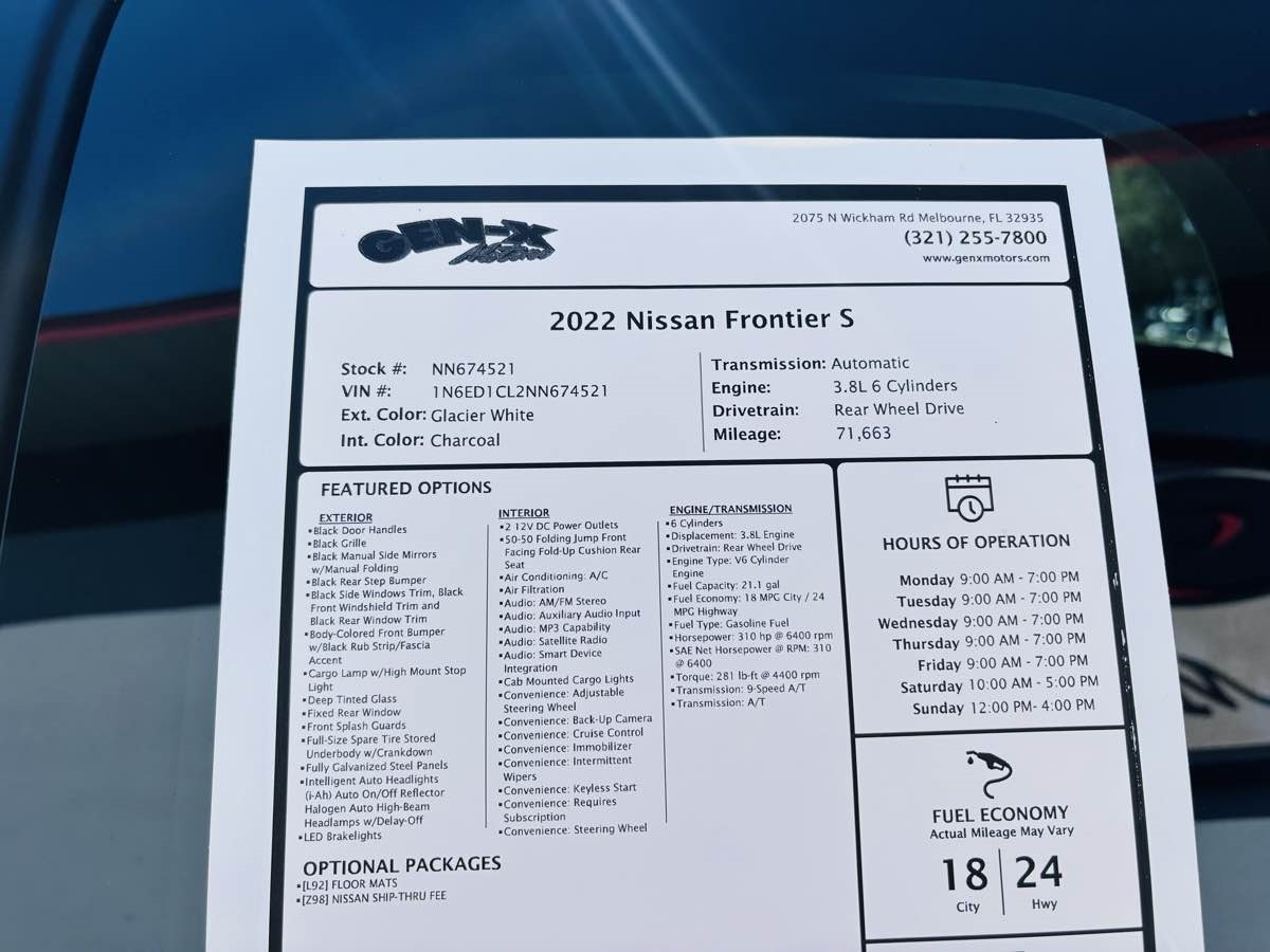 Our One Owner 2022 Nissan Frontier S King Cab 4X2 moves you with massive capability in Glacier White! Powered by a 3.8 Liter V6 that delivers 310hp connected to 9 Speed Automatic transmission with tow/haul mode to help make pulling easier. This Rear Wheel Drive truck also features a rugged Dana rear axle, plus it scores nearly 24mpg on the highway. Fierce and functional, our Frontier has terrific truck appeal with LED lighting, a bold black grille, matching accents, rear access doors, a bedliner, and a damped locking tailgate. Command and control come easy in our S cabin, which treats you right with comfortable cloth seats, a multifunction steering wheel, air conditioning, power accessories, cruise control, keyless access/ignition, and infotainment technology you can appreciate on the job or off. Highlights include a 7-inch driver display, an 8-inch touchscreen, Android Auto, Apple CarPlay, Bluetooth, and six-speaker audio. Nissan helps you stay safer as you go, thanks to intelligent driver assistance from a rearview camera, automatic braking, pedestrian detection, forward collision warning, a driver attention monitor, hill-start assistance, trailer sway control, and more. Our Frontier S is the midsize truck made to punch above its weight! Save this Page and Call for Availability. We Know You Will Enjoy Your Gen-X Motors Test Drive Towards Ownership! Good credit, bad credit, or even no credit - NO problem! Whether you have good credit or bad credit, we offer financing options for everyone with rates as low as 4.99%. Rest assured with our 7-day exchange policy, designed to give you peace of mind. If your new vehicle isnt the perfect fit, simply exchange it within seven days. Weve been in business since 1994 and are A+ rated with the Better Business Bureau and a Certified CarFax Dealer. All vehicles are Gen-X Motors certified. Select vehicles include a 3-month / 3,000-mile warranty. See dealer for more details. Gen-X Motors, (321)255-7800, 2075 N Wickham Rd, Melbourne, FL 32935. Coming from out of town? Turn your trip into a two-day beach getaway while picking up your new car! We offer free delivery within 250 miles and worldwide shipping. At Gen-X Motors, we make luxury affordable - come experience the new way to buy a pre-owned car.