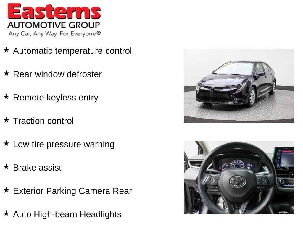 2022 Toyota Corolla LE Blue FWD CVT Apple CarPlay/Android Auto, Auto High-beam Headlights, Automatic temperature control, Brake assist, Exterior Parking Camera Rear, Low tire pressure warning, Power door mirrors, Rear window defroster, Remote keyless entry, Speed control, Split folding rear seat, Traction control.CARFAX One-Owner. 30/38 City/Highway MPGEasterns Automotive Group has 11 locations that has sold thousands of used cars in the Maryland, DC, and Virginia communities for over the past 35 years. Every Easterns vehicle has passed a rigorous Multi-Point Quality Certification, so you can buy with confidence. Start your purchase online to save time by visiting Easterns.com... Any Car, Any Way, For Everyone.