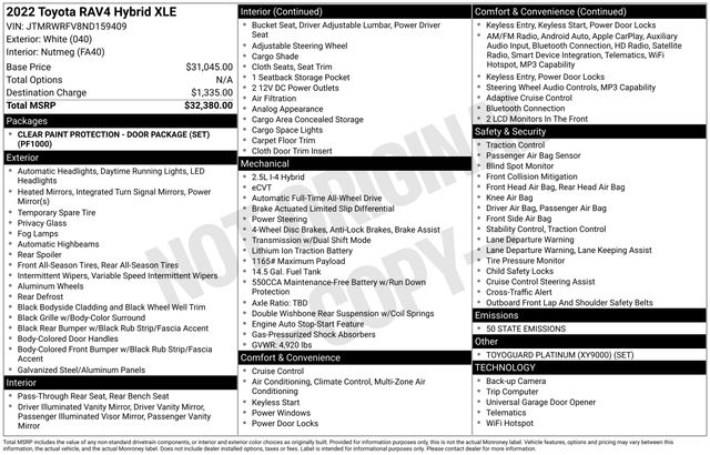 2.5L 4-Cylinder, 18 Alloy wheels, 4-Wheel Disc Brakes, 6 Speakers, ABS brakes, Air Conditioning, AM/FM radio: SiriusXM, AM/FM Stereo, Apple CarPlay/Android Auto, Auto High-beam Headlights, Automatic temperature control, Axle Ratio: TBD, Brake assist, Bumpers: body-color, Delay-off headlights, Driver door bin, Driver vanity mirror, Dual front impact airbags, Dual front side impact airbags, Electronic Stability Control, Emergency communication system: Safety Connect with 1-year trial, Exterior Parking Camera Rear, Fabric Seat Trim (FA), Four wheel independent suspension, Front anti-roll bar, Front Bucket Seats, Front Center Armrest, Front dual zone A/C, Front fog lights, Front reading lights, Front Sport Seats, Fully automatic headlights, Heated door mirrors, Illuminated entry, Knee airbag, Lane Departure Warning System, Low tire pressure warning, Occupant sensing airbag, Outside temperature display, Overhead airbag, Overhead console, Panic alarm, Passenger door bin, Passenger vanity mirror, Power door mirrors, Power driver seat, Power steering, Power windows, Radio data system, Rear anti-roll bar, Rear seat center armrest, Rear window defroster, Rear window wiper, Remote keyless entry, Roof rack: rails only, Speed control, Speed-sensing steering, Split folding rear seat, Spoiler, Steering wheel mounted audio controls, Telescoping steering wheel, Tilt steering wheel, Traction control, Trip computer, Turn signal indicator mirrors, Variably intermittent wipers, Wheels: 17 x 7.0J Silver Aluminum Alloy, 2.5L 4-Cylinder.2022 Toyota RAV4 Hybrid XLE White 2.5L 4-Cylinder eCVT AWDSouthern Pines Nissan Kia has a hole-in-one selection of high-quality used cars at affordable prices in Pinehurst. We also offer financing options, so you can drive off the lot without breaking the bank. Swing by today to see why buying an used car from us is a winning shot!