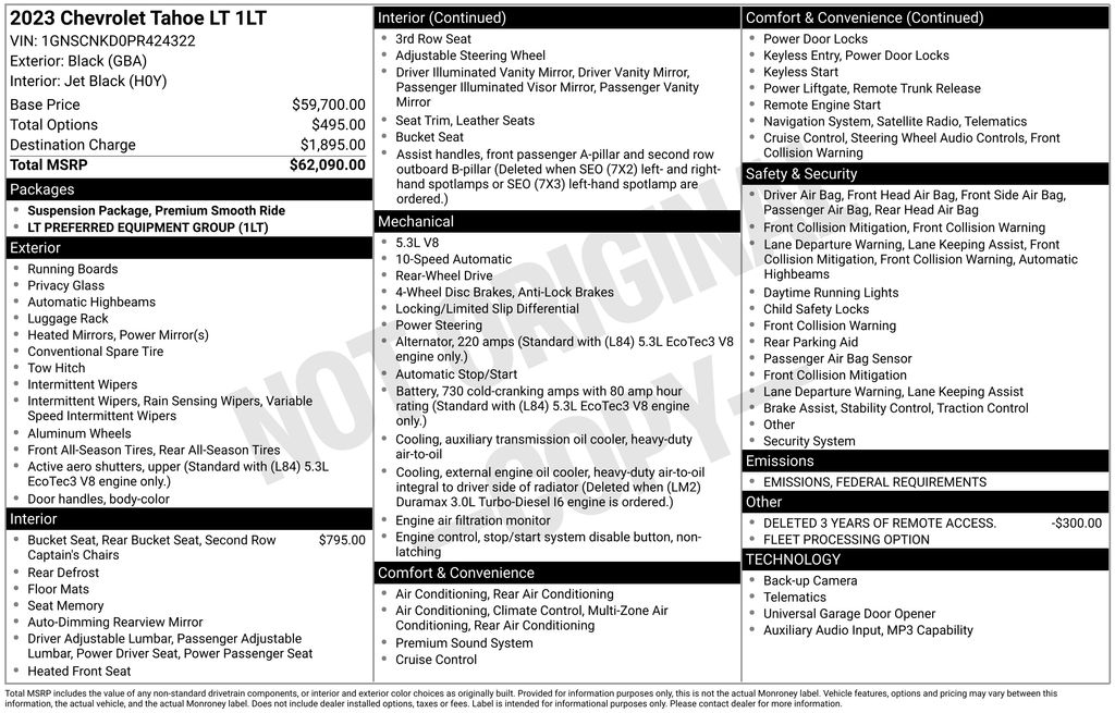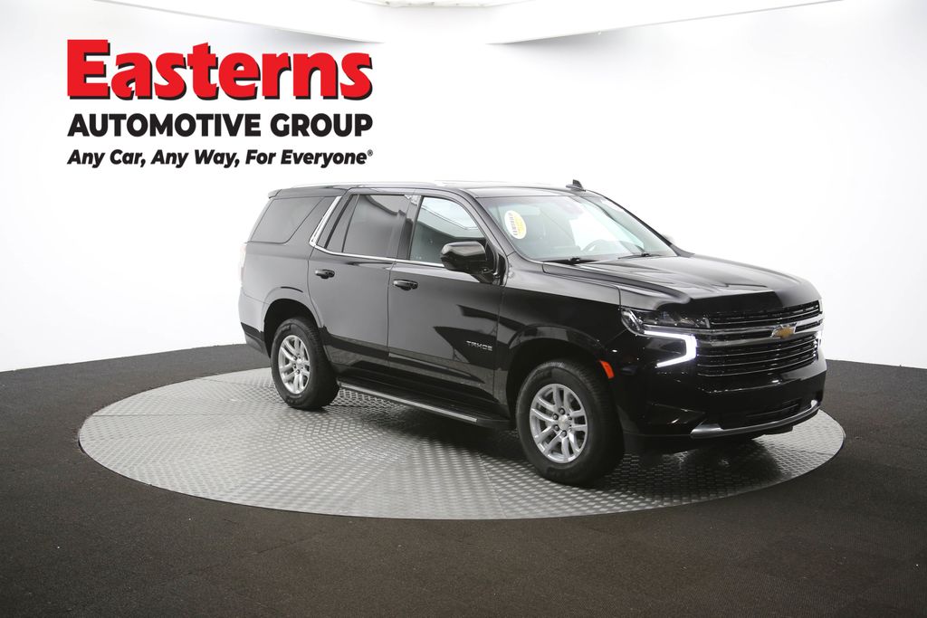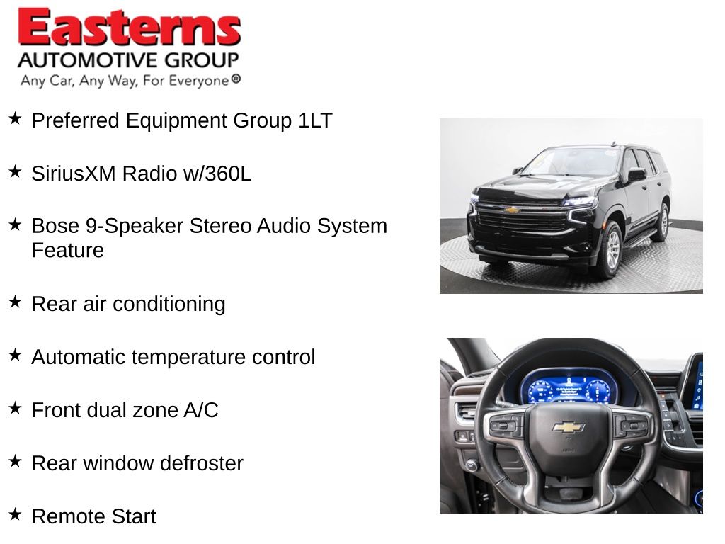 2023 Chevrolet Tahoe LT Black RWD 10-Speed Automatic with Overdrive Black Leather, 10-Way Power Driver & Passenger Seat Adjusters, 1st & 2nd Row Color-Keyed Carpeted Floor Mats, 2nd Row Manual Bucket Seats, 3rd row seats: split-bench, Apple CarPlay/Android Auto, Auto-Dimming Inside Rear-View Mirror, Automatic temperature control, Bose 9-Speaker Stereo Audio System Feature, Brake assist, Bright Front & Rear Door Sill Plates, Color-Keyed Carpeting Floor Covering, Driver & Front Outboard Passenger Airbags, Enhanced Driver Information Center, Floor Console w/Storage Area, Front dual zone A/C, Front High-Back Reclining Bucket Seats, Garage door transmitter, Hands-Free Rear Power Programmable Liftgate, Heated door mirrors, Heated Driver & Front Passenger Seats, Infotainment Display, Leather-Appointed Seat Trim, LED Daytime Running Lamps, Memory seat, Memory Settings for Driver, Power door mirrors, Power Liftgate, Preferred Equipment Group 1LT, Premium Smooth Ride Suspension, Rain sensing wipers, Rear air conditioning, Rear window defroster, Rear window wiper, Remote keyless entry, Remote Start, SiriusXM Radio w/360L, Speed control, Universal Home Remote, Wheels: 18 x 8.5 Bright Silver Painted Aluminum, Wireless Charging, Wrapped Steering Wheel.Odometer is 8518 miles below market average! Clean CARFAX. CARFAX One-Owner.Easterns Automotive Group has 11 locations that has sold thousands of used cars in the Maryland, DC, and Virginia communities for over the past 35 years. Every Easterns vehicle has passed a rigorous Multi-Point Quality Certification, so you can buy with confidence. Start your purchase online to save time by visiting Easterns.com... Any Car, Any Way, For Everyone.