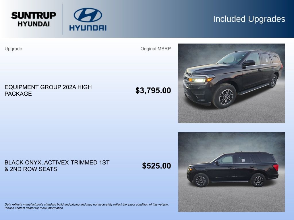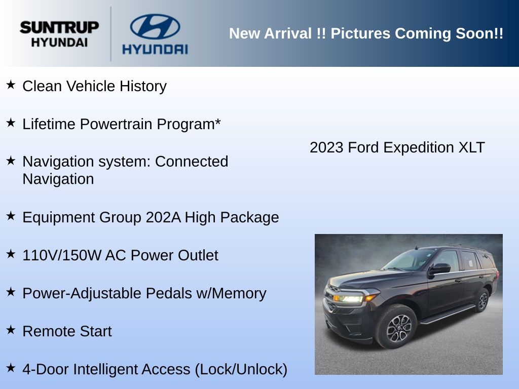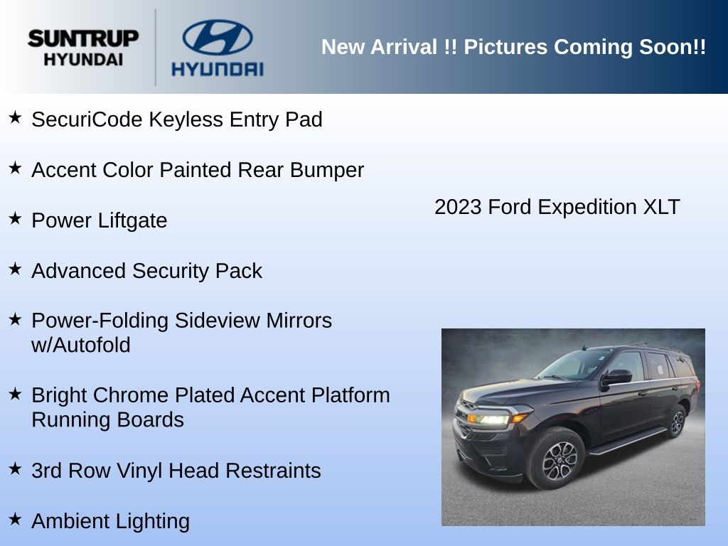 Discover the exceptional 2023 Ford Expedition XLT, a versatile and well-equipped SUV that's ready to elevate your driving experience. With its powerful EcoBoost V6 engine, 4-wheel drive capabilities, and an impressive array of premium features, this Expedition is poised to exceed your expectations.Highlighted by a sleek black exterior and a wealth of premium amenities, this Expedition XLT is the perfect blend of style and substance. Key features include: Lifetime Powertrain Program* Heated/Ventilated Front Seats Power-Adjustable Pedals with Memory Remote Start 4-Door Intelligent Access SecuriCode Keyless Entry Pad Power Liftgate Wireless Charging Pad Heated Steering Wheel Power Tilt/Telescopic Steering Wheel with Memory 2nd Row Power-Folding Captain's Chairs Ambient LightingThe EQUIPMENT GROUP 202A HIGH PACKAGE elevates this Expedition to new heights, offering an unparalleled level of comfort, convenience, and technology. From the advanced security features to the premium audio system, every aspect of this SUV has been thoughtfully designed to enhance your driving experience.With its impressive fuel efficiency, spacious 7-passenger seating, and a wealth of advanced safety technologies, the 2023 Ford Expedition XLT is the perfect companion for your adventures, whether you're traversing the city streets or exploring the great outdoors.We utilize Market Based Pricing for all pre-owned vehicles on our lot. This ensures you have the most competitive price in the market based on mileage, equipment, and features. Utilizing this approach, our prices may fluctuate during the day on our website and may not match what is currently on 3rd party sites as they only update every 24 hours. The Suntrup family have been servicing and selling cars since 1957 for the St Louis area.The Suntrup Automotive Group is active in its communities and believes in giving back. Today Suntrup Automotive Group has nine brands, eleven locations, thousands of cars and is every bit committed to providing excellent customer service in every aspect of the business. There's never been a better time to drop on by at our dealership here in 5926 So Lindbergh Blvd St Louis, Missouri, proudly serving drivers from Ballwin, Affton and Kirkwood. We're very much looking forward to it.