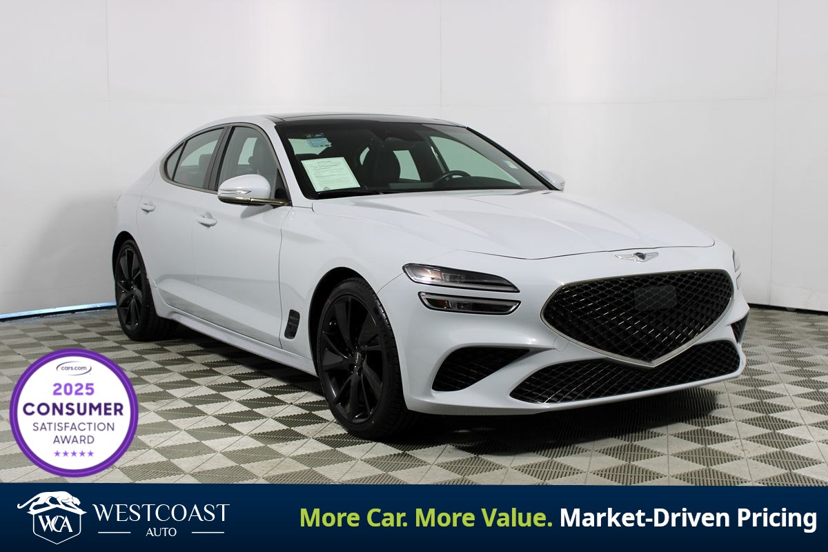 The 2023 Genesis G70 2.0T RWD is a striking symbol of modern luxury combined with performance-focused engineering. Cloaked in an elegant shade of Siberian Ice, this vehicle's external aesthetics are nothing short of breathtaking, capturing refined sophistication with its sleek lines and meticulous craftsmanship. The captivating exterior is complemented by a meticulously designed cabin featuring Obsidian Black/Red Stitch upholstery, creating a striking blend of style and comfort that perfectly suits the discerning driver.Under the hood, the G70 houses a powerful 2.0L 4-cylinder engine, ensuring a thrilling and responsive driving experience that perfectly suits its rear-wheel-drive configuration. The vehicle is decked with advanced features like active cruise control and blind spot monitoring, providing peace of mind on every journey. Its array of comfort-oriented features includes heated and ventilated seats, crucial for ensuring comfort regardless of the weather. Safety is further enhanced with forward collision warning and lane departure warning systems, while parking becomes effortless with the parking assist feature. For added convenience, the hands-free liftgate, rain sensing wipers, and Sport Prestige Package enhance both usability and driving enjoyment.Customization options like the bumper applique add personalized touches, while wheel locks offer additional security. The inclusion of the premium first aid kit highlights Genesis's attention to safety and preparedness. These thoughtful details, combined with the dynamic sport steering and striking interior accents, make the 2023 Genesis G705 2.0T RWD a standout choice for those seeking a harmonious blend of luxury, performance, and state-of-the-art technology. 72 HOUR FLASH EVENT WESTCOAST AUTO CPO-Quality Vehicles. Market-Driven Pricing. Serious Approvals. For 72 hours, were spotlighting some of the cleanest inventory in Southern California. At West Coast Auto, we specialize in exceptionally well-kept, fully inspected vehicles selected for condition, options, and overall quality. Market-Positioned Pricing Aggressive Financing Approvals Credit Challenge Welcome Trade-In Assistance Fast, Professional Buying Experience This event is built for buyers who care about quality, strong approvals, and a smooth transaction.