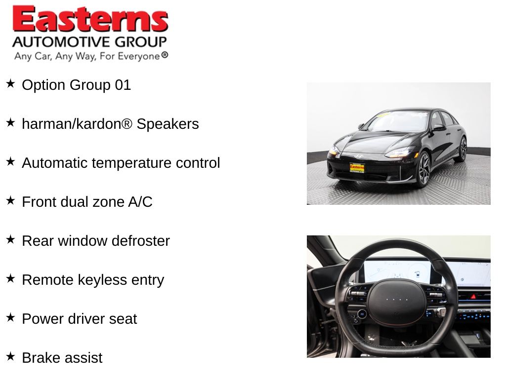 2023 Hyundai IONIQ 6 SEL Onyx Black AWD 1-Speed Automatic Apple CarPlay & Android Auto, Auto High-beam Headlights, Automatic temperature control, Brake assist, Carpeted Floor Mats, Front dual zone A/C, Garage door transmitter: HomeLink, H-Tex Leatherette Seating Surfaces, harman/kardon Speakers, Heated door mirrors, Heated Front Bucket Seats, Mudguards, Option Group 01, Power door mirrors, Power driver seat, Rear Reversible Cargo Tray, Rear window defroster, Remote keyless entry, Speed control, Split folding rear seat, Wheels: 20 x 8.5J Alloy.CARFAX One-Owner. 111/94 City/Highway MPGEasterns Automotive Group has 11 locations that has sold thousands of used cars in the Maryland, DC, and Virginia communities for over the past 35 years. Every Easterns vehicle has passed a rigorous Multi-Point Quality Certification, so you can buy with confidence. Start your purchase online to save time by visiting Easterns.com... Any Car, Any Way, For Everyone.