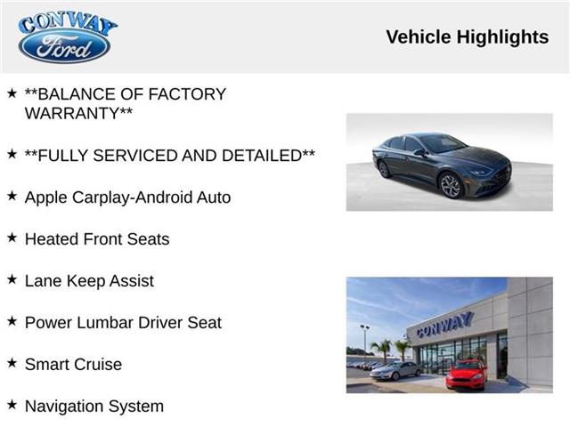 **ONE OWNER**, **NO ACCIDENTS NO ISSUES**, **BLUETOOTH HANDS FREE**, **BACK UP CAMERA**, **LEATHER INTERIOR**, **POWER DRIVER'S SEAT**, **BLIND SPOT MONITOR**, **NAVIGATION**, **BALANCE OF FACTORY WARRANTY**, **FULLY SERVICED AND DETAILED**, Apple Carplay-Android Auto, Heated Front Seats, Lane Keep Assist, Power Lumbar Driver Seat, Smart Cruise, Sonata SEL, 4D Sedan, 2.5L I4, FWD, Portofino Gray, 4-Wheel Disc Brakes, ABS brakes, Adaptive Cruise Control, Air Conditioning, AM/FM radio: SiriusXM, Auto High-beam Headlights, Automatic temperature control, Brake assist, Delay-off headlights, Dual front impact airbags, Dual front side impact airbags, Dual Zone Auto A/C, Electronic Stability Control, Exterior Parking Camera Rear, Four wheel independent suspension, Fully automatic headlights, Knee airbag, Low tire pressure warning, Navigation System, Option Group 01, Panic alarm, Power driver seat, Power windows, Radio data system, Radio: AM/FM/MP3/HD/SiriusXM Display Audio w/Nav, Rear window defroster, Remote keyless entry, Steering wheel mounted audio controls. 27/37 City/Highway MPG Portofino Gray 2023 Hyundai Sonata SEL FWD 8-Speed Automatic with SHIFTRONIC CARFAX One-Owner. Clean CARFAX. Recent Arrival! 2.5L I4 Thank you for choosing Conway Ford Inc. To help you find your next dream car. We have a large selection of new and used Fords, and we also offer an assortment of other used makes and models. Conway Ford Inc. Is South Carolina drivers' one-stop-shop for car shopping, finance and repair needs. Our customers keep coming back because we treat them like family, and you won't be an exception. We look forward to seeing you soon.