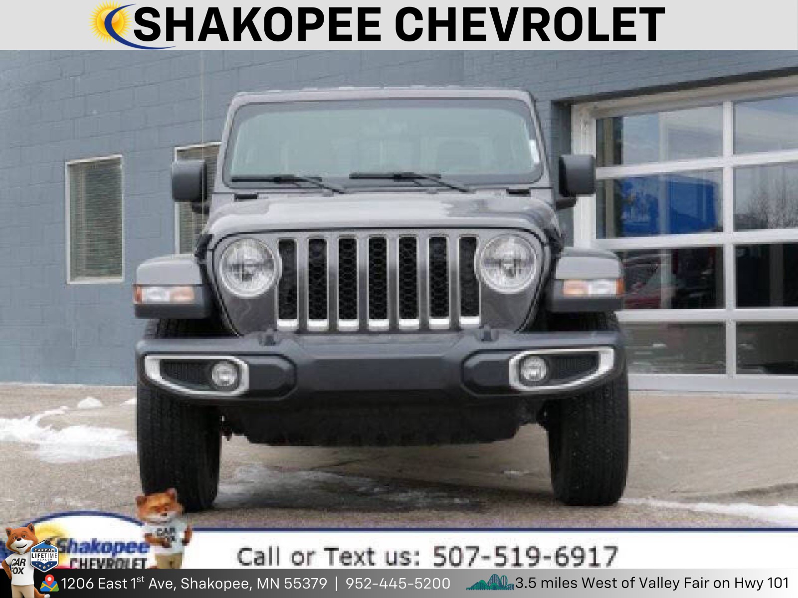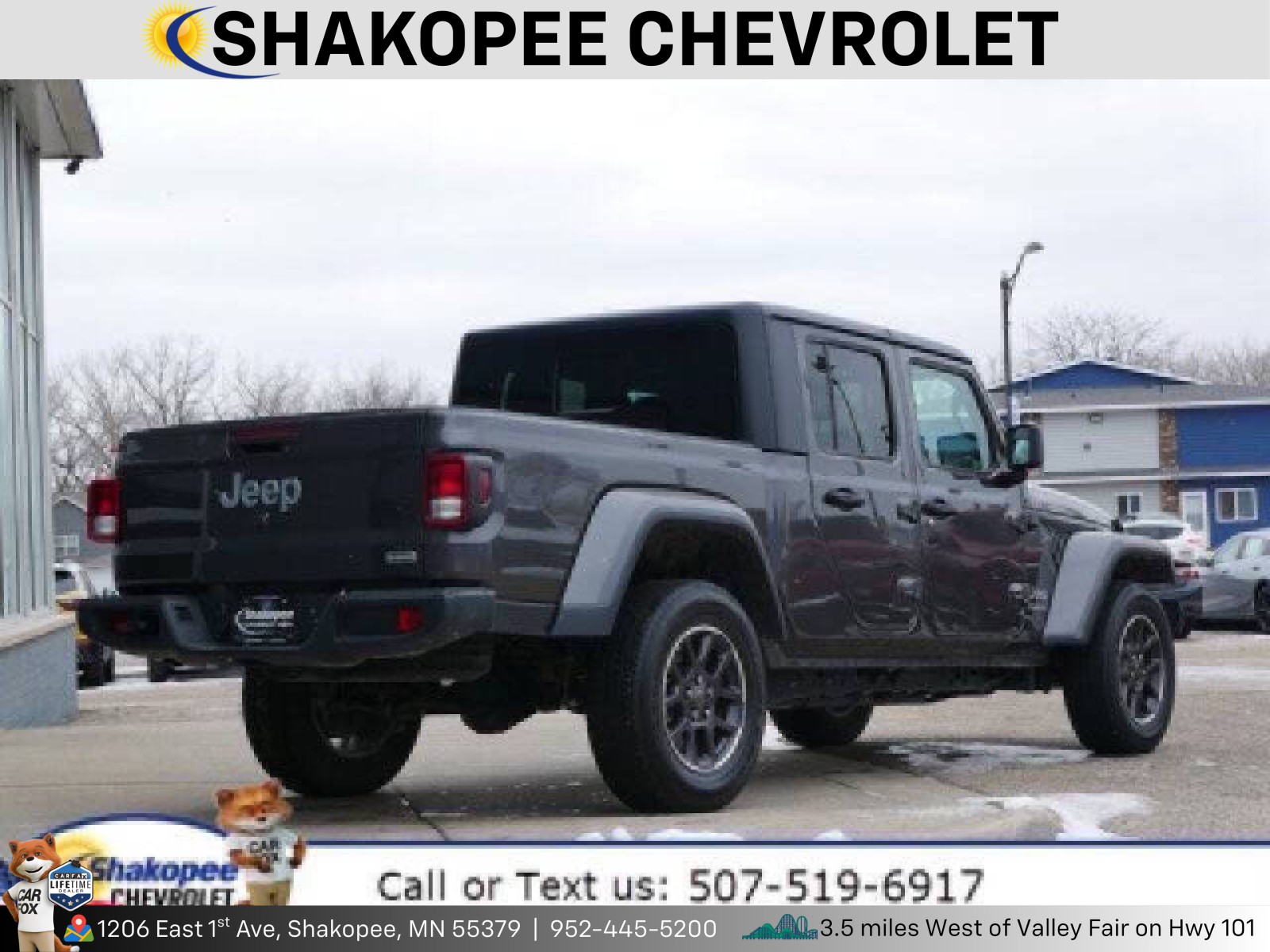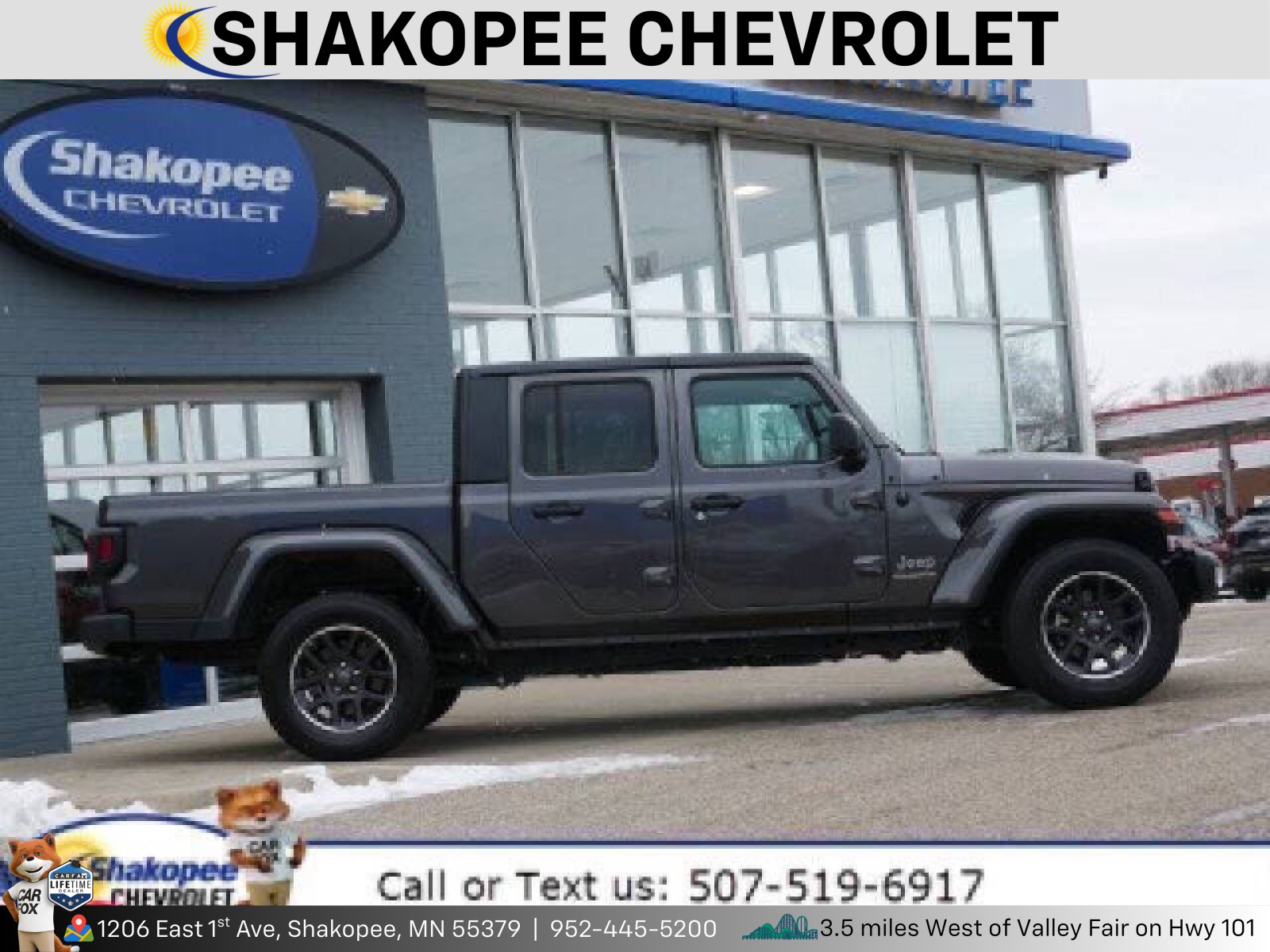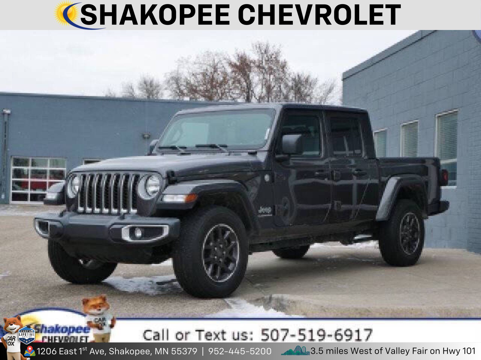 Contact Shakopee Chevrolet today for information on dozens of vehicles like this 2023 Jeep Gladiator Overland. <p>This Jeep includes:</p> <p><strong style=font-size: 10pt;>Optional Equipment:</strong></p> <ul> <li><strong>Convenience</strong> <ul> <li>Rear window defroster</li> <li>Sliding rear windshield</li> </ul> </li> <li><strong>Exterior and Appearance</strong> <ul> <li>Convertible hardtop</li> <li>Metallic paint</li> <li>First-row targa composite sunroof with manual activation</li> <li>Convertible roof with glass rear window</li> <li>Front license plate bracket</li> <li>Removable sunroof</li> </ul> </li> <li><strong>Exterior</strong> <ul> <li>Black 3-Piece Hard Top <ul> <li>Manual convertible roof</li> <li>Convertible hardtop</li> <li>Rear window defroster</li> <li>Sliding rear windshield</li> <li>First-row targa composite sunroof with manual activation</li> <li>Convertible roof with glass rear window</li> <li>Removable sunroof</li> </ul> </li> <li>Front License Plate Bracket <ul> <li>Front license plate bracket</li> </ul> </li> <li>Freedom Panel Storage Bag</li> <li>Rear Window Defroster <ul> <li>Rear window defroster</li> </ul> </li> <li>Rear Sliding Window <ul> <li>Sliding rear windshield</li> </ul> </li> <li>No Soft Top</li> </ul> </li> <li><strong>Interior</strong> <ul> <li>Black</li> </ul> </li> <li><strong>Engine</strong> <ul> <li>Auxiliary Battery</li> <li>Stop-Start Dual Battery System</li> </ul> </li> <li><strong>Paint</strong> <ul> <li>Granite Crystal Met CC <ul> <li>Metallic paint</li> </ul> </li> </ul> </li> </ul> *Note - For third party subscriptions or services, please contact the dealer for more information.*<br /> <p>Why does this vehicle look so great? The CARFAX report shows it's only been owned by one owner. Today's luxury vehicle is not just about opulence. It's about a perfect balance of performance, comfort and attention to detail. This 2023 Jeep Gladiator Overland is the perfect example of the modern luxury.</p> <p>Taking the road less traveled has never been more fun than with this 4WD. With improved performance, mileage and acceleration, this 2023 4WD Jeep Gladiator Overland is king of the off-road. This Jeep Gladiator offers the most up-to-date navigation system available so you'll always know the most efficient route to where you are going.</p> <p>Pre-owned doesn't have to mean used. The clean interior of this Jeep Gladiator makes it one of the nicest you'll find. The Jeep Gladiator Overland is in a class on its own. So much so, that Jeep didn't miss a beat when they loaded this vehicle with an abundance of a-la-carte options.</p> Shakopee Chevrolet is excited to offer this 2023 Jeep Gladiator Overland. <p>Quality and prestige abound with this Jeep Gladiator Overland. Taking the road less traveled has never been more fun than with this 4WD. With improved performance, mileage and acceleration, this 2023 4WD Jeep Gladiator Overland is king of the off-road.</p> <p>Just what you've been looking for. With quality in mind, this vehicle is the perfect addition to take home. The Jeep Gladiator Overland will provide you with everything you have always wanted in a car -- Quality, Reliability, and Character.</p>