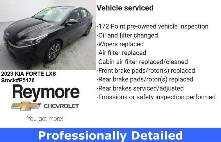 CARFAX One-Owner. Clean CARFAX. Priced below KBB Fair Purchase Price! Odometer is 1895 miles below market average! 28/39 City/Highway MPG<br><br>Cloth Seats, Back-Up Camera, Forward Collision Warning, Lane Departure Warning, Lane Keeping Assist, Brake Assist, Bluetooth Connection, CarPlay/Android Auto, Steering Wheel Audio Controls, Smart Device Integration, Keyless Entry, Auto High Beam Headlights, 16 x 6.5J Alloy Wheels, Front Bucket Seats.<br>2023 Kia Forte LXS FWD CVT 2.0L I4 MPI Aurora Black Pearl<br><br><br>Any of our Pre-Owned vehicles at Reymore Chevrolet may be subject to an open recall by the manufacturer. Please contact us for details or simply copy and paste the vin into https://vinrcl.safercar.gov/vin/ for additional info. Thank You!