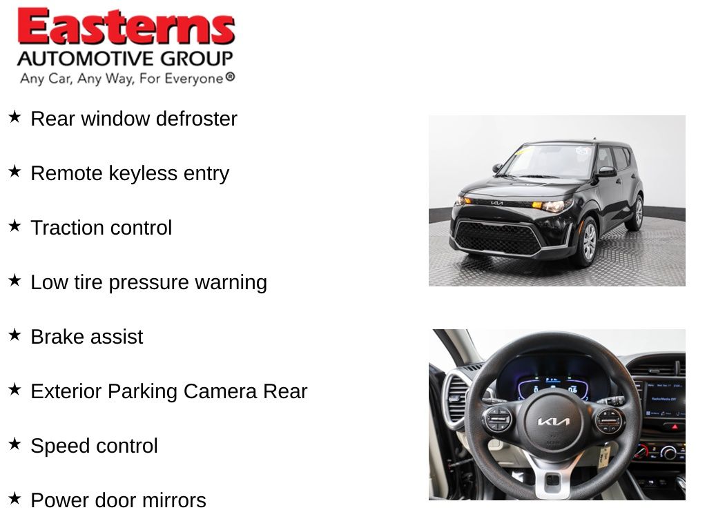 2023 Kia Soul LX Fusion Black FWD CVT 16 Alloy Wheels, Apple CarPlay & Android Auto, Brake assist, Carpeted Floor Mats, Exterior Parking Camera Rear, Low tire pressure warning, Power door mirrors, Rear window defroster, Rear window wiper, Remote keyless entry, Speed control, Split folding rear seat, Traction control, Woven & Tricot Cloth Seat Trim.Clean CARFAX. CARFAX One-Owner. 29/35 City/Highway MPGEasterns Automotive Group has 11 locations that has sold thousands of used cars in the Maryland, DC, and Virginia communities for over the past 35 years. Every Easterns vehicle has passed a rigorous Multi-Point Quality Certification, so you can buy with confidence. Start your purchase online to save time by visiting Easterns.com... Any Car, Any Way, For Everyone.