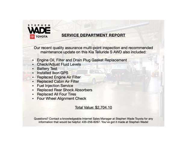 ONE OWNER CLEAN CARFAX. 2023 Kia Telluride S AWD in Glacial White Pearl with Black SynTex. 3.8L Gas Direct Injection V6 Engine, 8-Speed Automatic Transmission, Active On-Demand All Wheel Drive.Odometer is 6,809 miles below market average!CALL STEPHEN WADE TOYOTA: 435-241-3828.Glacial White Pearl Paint.Carpeted Floor Mats.SERVICE REPORT: At Stephen Wade Toyota, we do more to insure we offer the most mechanically sound pre-owned vehicles with maintenance that is up to date. Our recent quality assurance multi-point inspection and recommended maintenance update on this Kia Telluride S AWD also included an engine oil, filter and drain plug gasket replacement, check/adjust fluid levels, battery test, installed Ikon GPS, replaced engine air filter, replaced cabin air filter, fuel injection service, replaced rear shock absorbers, replaced all four tires and a four wheel alignment check - a $2,704.10 value.MARKET REPORT: We use advanced software to shop the automotive marketplace nationwide everyday. This allows us to competitively offer you the best value one can find anywhere. Contact our knowledgeable Internet sales managers; Danny, Jessica or Wesley at Stephen Wade Toyota for a priority test drive, or for any information that would be helpful: 435-241-3828. You've got it made at Stephen Wade!
