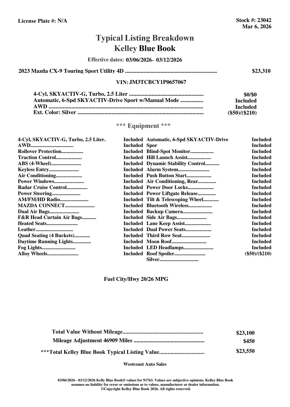 Our adventure ready One Owner 2023 Mazda CX-9 Touring AWD in Sonic Silver Metallic is built for your active family! Powered by a TurboCharged 2.5 Liter 4 Cylinder that supplies 227hp tethered to a 6 Speed Automatic transmission for sporty acceleration and capable towing. This All Wheel Drive SUV also features responsive handling and returns nearly 26mpg on the highway, and it's ready to make a bold impression with a detailed design. A power sunroof, power liftgate, LED lighting, fog lamps, heated power mirrors, alloy wheels, and dual exhaust outlets are just the start! Slide inside our Touring cabin to find a versatile layout with smart comfort cues like heated leather power front seats, second-row captain's chairs, a split-folding third row, a leather-wrapped wheel, tri-zone automatic climate control, keyless access/ignition, and a wealth of infotainment tech. Leading the way is a 10.25-inch color display with a Commander controller, Android Auto/Apple CarPlay, Bluetooth, wireless charging, and a six-speaker sound system. Mazda helps keep you and your loved ones safe with a backup camera, automatic braking, a head-up display, a blind-spot monitor, adaptive cruise control, lane-keeping assistance, and more. Our Mazda CX-9 Touring is for families that enjoy the drive as much as the destination! Save this Page and Call for Availability. We Know You Will Enjoy Your Test Drive Towards Ownership! Great quality, easy financing and affordable prices aren't the only things that make Westcoast Auto Sales the first choice of many discerning auto buyers. Stop in and See California's Dealer of the Year! 72 HOUR FLASH EVENT WESTCOAST AUTO CPO-Quality Vehicles. Market-Driven Pricing. Serious Approvals. For 72 hours, were spotlighting some of the cleanest inventory in Southern California. At West Coast Auto, we specialize in exceptionally well-kept, fully inspected vehicles selected for condition, options, and overall quality. Market-Positioned Pricing Aggressive Financing Approvals Credit Challenge Welcome Trade-In Assistance Fast, Professional Buying Experience This event is built for buyers who care about quality, strong approvals, and a smooth transaction.