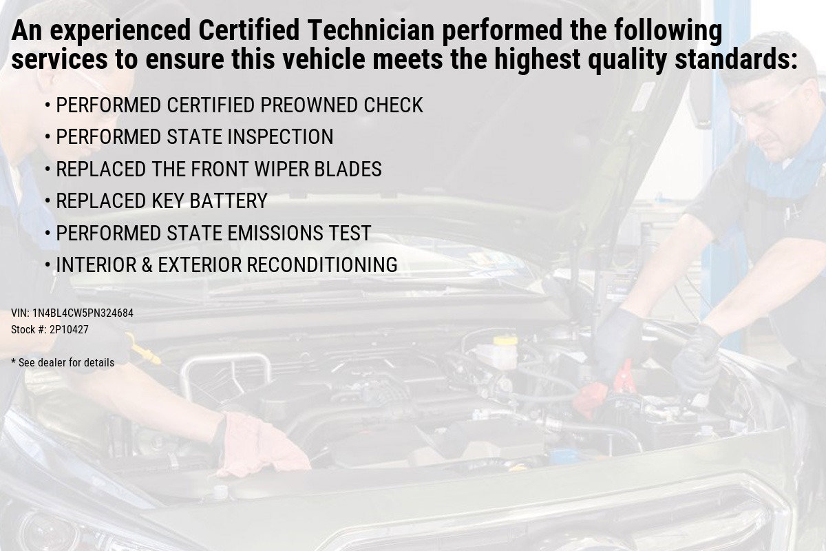MOYER NISSAN is proud to offer this. Certified. 2023 Nissan Altima Pearl White Tricoat 2.5 SR Nissan Details: * Vehicle History (for Nissan Certified program) * Transferable Warranty (for Nissan Certified program), Transferable Warranty (for Certified Select program) * 167 Point Inspection (for Nissan Certified program), 84 Point Inspection (for Certified Select program), 139 Point Inspection (for EV Certified program) * 7 Year/100,000 Mile Limited Warranty, 24/7 Hour Roadside Assistance, Carfax Vehicle History Report, Plus 1 Year Pre-Paid Maintenance Included. Gas Powered Nissan Models Only. (for Nissan Certified program), 12-Months/12,000 Mile Limited Warranty, 24/7 Hour Roadside Assistance, Carfax Vehicle History Report, Plus 1 Complimentary Service Visit During the First Year of Ownership or First 15,000 Miles, Whichever Comes First. (for Certified Select program), 7-Year/100,000 Mile Limited Warranty, 1 Year Prepaid Maintenance Included in the First Year of Ownership or 15,000 Miles, Whichever Comes First. 100% Electric Nissan Models Only. (for EV Certified program) * Limited Warranty: 12 Month/12,000 Mile (whichever occurs first) (for Certified Select program), 84 Month/100,000 Mile (whichever occurs first) (for EV Certified program), 84 Month/100,000 Mile (whichever occurs first) (for Nissan Certified program) * Roadside Assistance (for Nissan Certified program) * Warranty Deductible: $100 (for Nissan Certified program), $100 (for Certified Select program) CVT with Xtronic 2.5L 4-Cylinder DOHC 16V 4-Wheel Disc Brakes, 6 Speakers, ABS brakes, Air Conditioning, Alloy wheels, AM/FM radio: SiriusXM, Auto High-beam Headlights, Blind Spot Warning, Body-Colored Rear Spoiler, Body-Colored Splash Guards, Brake assist, Bumpers: body-color, Chrome Bumper Protector, Delay-off headlights, Driver door bin, Driver vanity mirror, Dual front impact airbags, Dual front side impact airbags, Electronic Stability Control, Four wheel independent suspension, Front anti-roll bar, Front Bucket Seats, Front Center Armrest, Front reading lights, Front Sport Bucket Seats, Fully automatic headlights, Illuminated entry, Knee airbag, Leather Shift Knob, Low tire pressure warning, NissanConnect featuring Apple CarPlay and Android Auto, Occupant sensing airbag, Outside temperature display, Overhead airbag, Overhead console, Panic alarm, Passenger door bin, Passenger vanity mirror, Power door mirrors, Power driver seat, Power steering, Power windows, Radio data system, Radio: AM/FM Audio System, Rear anti-roll bar, Rear Parking Sensors, Rear reading lights, Rear seat center armrest, Rear side impact airbag, Rear window defroster, Remote keyless entry, Security system, Speed control, Speed-sensing steering, Speed-Sensitive Wipers, Split folding rear seat, Sport Seat Trim, SR Floor Mats/Trunk Mat/Hideaway Nets, Steering wheel mounted audio controls, Tachometer, Telescoping steering wheel, Tilt steering wheel, Traction control, Trip computer, Trunk Organizer Tray, Variably intermittent wipers, Wheels: 19' Sport Alloy. 4-Wheel Disc Brakes, 6 Speakers, ABS brakes, Air Conditioning, Alloy wheels, AM/FM radio: SiriusXM, Auto High-beam Headlights, Blind Spot Warning, Body-Colored Rear Spoiler, Body-Colored Splash Guards, Brake assist, Bumpers: body-color, Chrome Bumper Protector, Delay-off headlights, Driver door bin, Driver vanity mirror, Dual front impact airbags, Dual front side impact airbags, Electronic Stability Control, Four wheel independent suspension, Front anti-roll bar, Front Bucket Seats, Front Center Armrest, Front reading lights, Front Sport Bucket Seats, Fully automatic headlights, Illuminated entry, Knee airbag, Leather Shift Knob, Low tire pressure warning, NissanConnect featuring Apple CarPlay and Android Auto, Occupant sensing airbag, Outside temperature display, Overhead airbag, Overhead console, Panic alarm, Passenger door bin, Passenger vanity mirror, Power door mirrors, Power drive