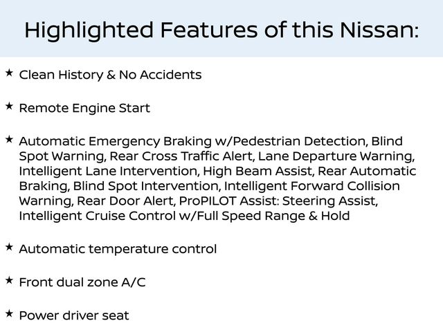 Clean History & No Accidents, Remote Engine Start, Automatic Emergency Braking w/Pedestrian Detection, Blind Spot Warning, Rear Cross Traffic Alert, Lane Departure Warning, Intelligent Lane Intervention, High Beam Assist, Rear Automatic Braking, Blind Spot Intervention, Intelligent Forward Collision Warning, Rear Door Alert, ProPILOT Assist: Steering Assist, Intelligent Cruise Control w/Full Speed Range & Hold, AWD, Alloy wheels, Automatic temperature control, Black Splash Guards (Set of 4), Chrome Rear Bumper Protector, Front dual zone A/C, Fully Automatic Headlights, NissanConnect featuring Apple CarPlay and Android Auto, Power driver seat, Remote Keyless Entry.Included with our Pre-Owned Promise you will receive: * 12 Months or 12k mile Wearable Item Coverage * 6 Months or 6k mile Major Item Coverage * 30 Day Exchanges * 12 Months of Roadside Assistance and much more!! Click her for complete details http://www.hoselton.com/about-us/hoselton-preowned-promise/Please call us @ (585) 662-2670 with any questions and to check availability.