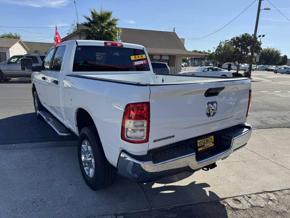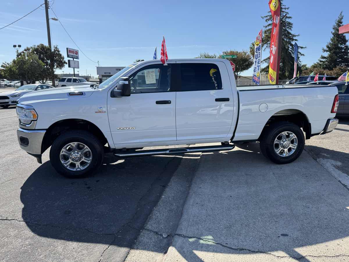 Rugged and Diesel powered, our One Owner 2023 RAM 2500 Big Horn Crew Cab 4X4 with the Level 1 Pack can get your next challenge off to a strong start in Bright White! Motivated by a TurboCharged 6.7 Liter Cummins Diesel 6 Cylinder offering 370hp and 850lb-ft of torque to a 6 Speed Automatic transmission that puts mighty muscle at your command. This Four Wheel Drive truck also has a heavy-duty suspension for heavyweight towing and hauling, and it looks great. Owners can look forward to quad halogen headlamps, running boards, alloy wheels, chrome grille accents, and our Level 1 Pack for fog lamps and heated power-extending/folding trailer mirrors. Our smart Big Horn cabin is tailored for people who prefer comfort with their capability. It shows off cloth seats, air conditioning, power accessories, pushbutton ignition, keyless access, a 12V power outlet, door-sill scuff plates, cruise control, and our Level 1 Pack for a leather-wrapped steering wheel, a sliding rear window, and a Uconnect 5 infotainment system with an 8.4-inch touchscreen, Android Auto, Apple CarPlay, Bluetooth, and a six-speaker sound system with SiriusXM compatibility. RAM helps you avoid harm's way with safety measures such as a high-strength steel frame, a rearview camera, hill start assistance, tire pressure monitoring, trailer sway control, ABS, stability/traction control, advanced airbags, and more. Taking on challenges is what our 2500 Big Horn is all about! Save this Page and Call for Availability. We Know You Will Enjoy Your Yosemite Motors Test Drive Towards Ownership!