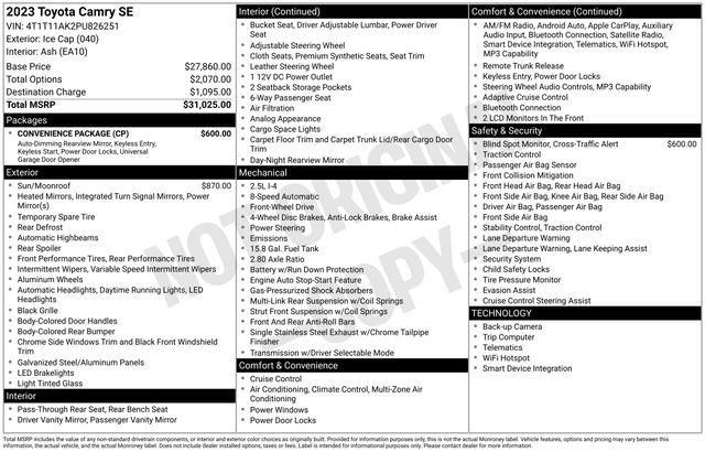At Westgate Dodge Ram Kia of Wake Forest we provide what every customer wants our Best Price upfront. No need to negotiate as we use live market data for pricing to provide a current competitive price based on year, make, model, miles, options, and condition of the vehicle. Online pricing does not include our documentation fee of $799, taxes, government fees, and anti theft recovery device installed with 1 year of service included for $799. 5 years of service for $1,499 available. Still under Toyota factory warranty until 60K miles, and eligible for up to 100K miles warranty!! POWER TILT/SLIDE MOONROOF CONVENIENCE PACKAGE: Includes HomeLink, Auto-Dimming Rearview Mirror, Smart Key System w/Push Button Start BLIND SPOT MONITOR W/REAR CROSS TRAFFIC ALERT AM/FM radio: SiriusXM, Automatic temperature control, Front dual zone A/C, Remote keyless entry, Traction control, ABS brakes, Low tire pressure warning, Electronic Stability Control, Exterior Parking Camera Rear, Auto High-beam Headlights, Fully automatic headlights, Active Cruise Control, Heated door mirrors, Apple CarPlay/Android Auto, Illuminated entry, 8.0J x 18 Alloy WheelsThis 2023 Toyota Camry SE is the perfect blend of style, performance, and technology. With its sleek white exterior and spacious, well-appointed interior, this Camry SE is ready to take you wherever life's adventures lead. Under the hood, the 2.5L I4 DOHC 16V engine paired with the 8-speed automatic transmission delivers an impressive 28 city/39 highway MPG, making this Camry an exceptional choice for both daily commutes and longer road trips. The responsive handling and smooth ride quality will have you enjoying every mile.Beyond the impressive powertrain, this Camry SE is packed with an array of advanced features that elevate the driving experience. The power tilt/slide moonroof, convenient smart key system, and blind spot monitoring with rear cross-traffic alert are just a few of the standout amenities that set this vehicle apart. And with the comprehensive Toyota warranty, you can purchase with confidence, knowing your investment is protected.Whether you're in the market for a practical, fuel-efficient sedan or seeking a well-equipped, feature-rich vehicle, this 2023 Toyota Camry SE is sure to impress. We invite you to experience the exceptional quality and value of this remarkable Camry for yourself. Schedule a test drive today and discover why this Camry SE should be your next vehicle.Shop with confidence at Westgate Kia and Westgate Dodge Ram in Wake Forest, NC, your go-to destination for new Kia and Ram vehicles as well as a wide selection of quality pre-owned cars, trucks, and SUVs. Serving Wake Forest, Raleigh, the greater Triangle, and surrounding communities, Westgate delivers trusted service, competitive pricing, and a hassle-free buying experience for every driver in North Carolina.